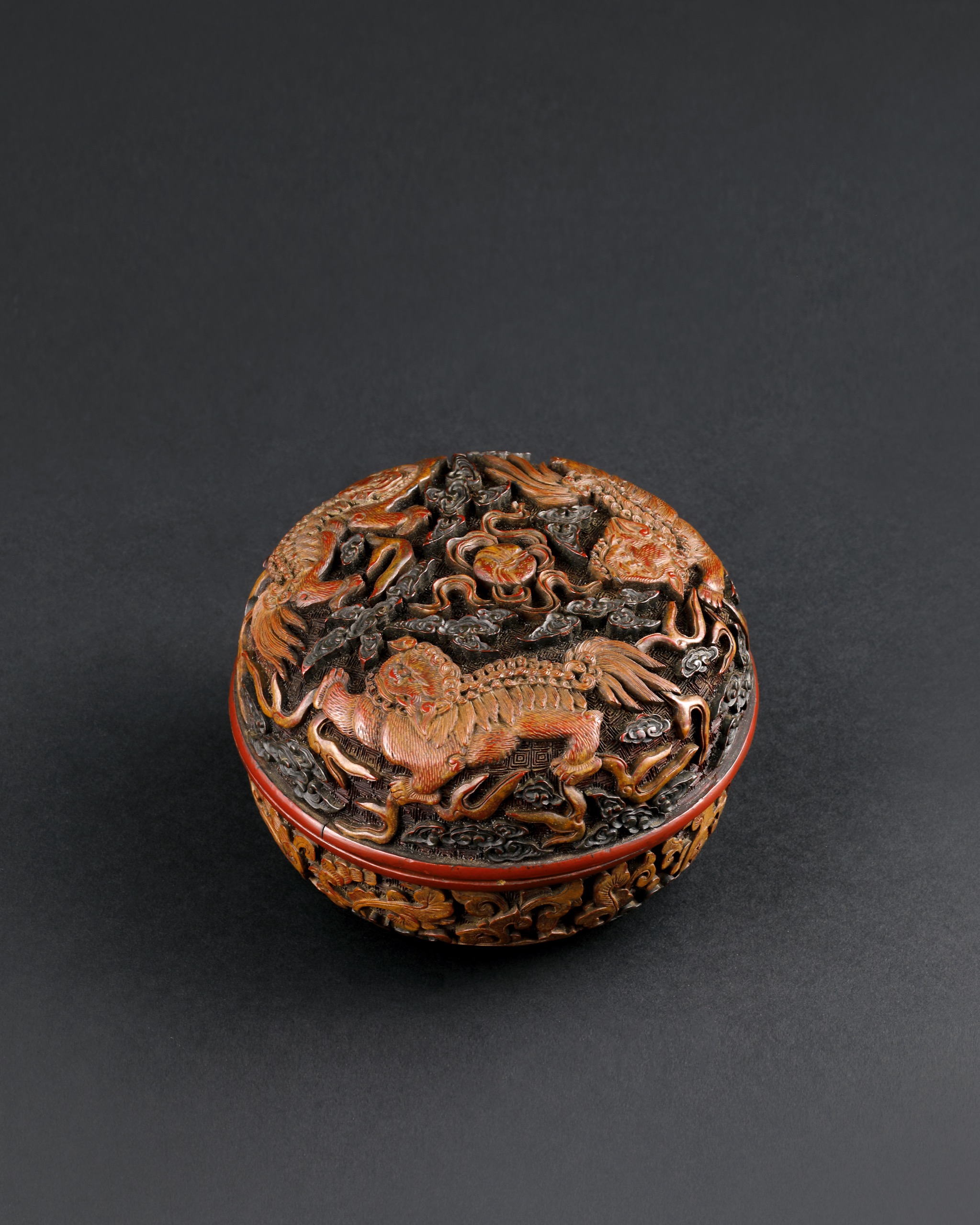 此件清早期剔彩香盒,呈圓形蓋盒制,造型圓潤飽滿,蓋與身緊密合縫,比例勻稱,轉折圓滑。器表滿飾高浮雕圖案,雕工繁密立體,層次井然,蓋面主紋為「三獅戲球」,三隻獅子環繞寶珠,形態各異,鬃毛翻卷,神態生動,四周環繞翻騰雲紋,氣勢奔放,背景以細密回字錦地襯底,繁而不亂,富有裝飾張力。