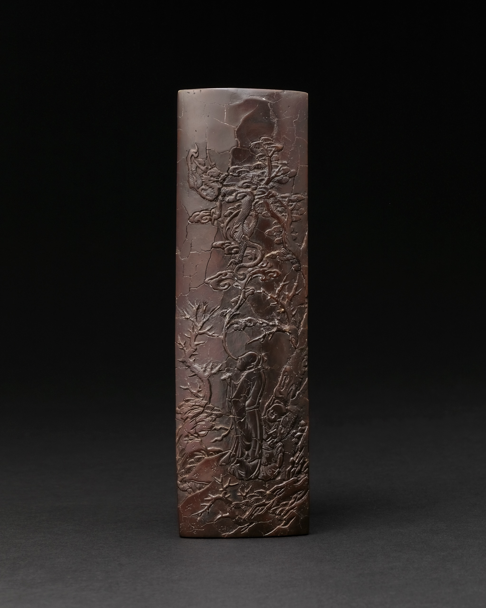 此件清早期雕漆臂擱,器形修長微弧,通體髹漆沉栗,色澤醇厚內斂。表面自然開片,縱橫交錯成百裂紋理,肌理斑駁而仍見潤澤,古意盎然。正面以高浮雕刻松林高士圖,古松盤曲虬勁,枝幹橫斜上展,松針層層鋪陳;高士立於松下,衣袂垂拂,神情恬淡,侍童隨側相應。高士口乎如意雲氣,幻化蛟龍穿雲而出,龍身蜿蜒回轉,與松枝動勢呼應,山石花卉錯落其間,層次分明,刀法勁健細密。