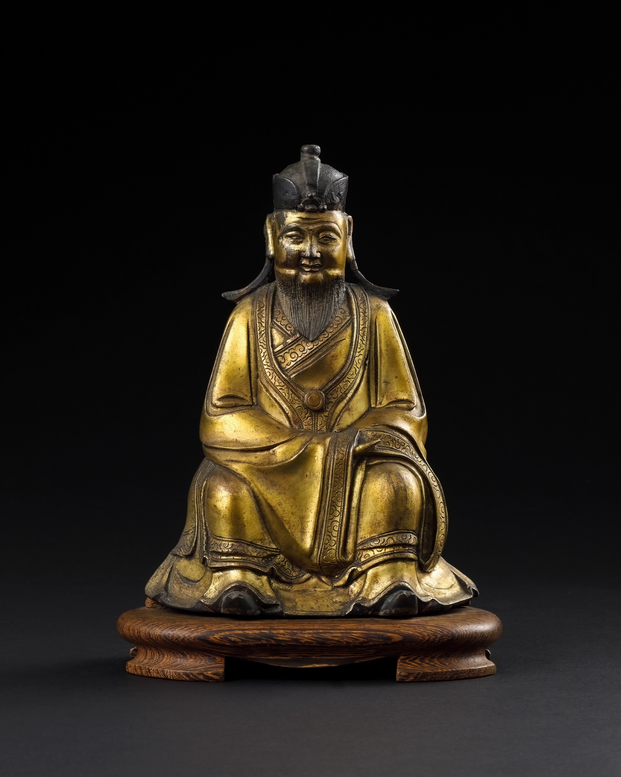 此尊銅鎏金文官坐像,整體造型端凝穩重,氣度沉靜而內蘊含蓄。文官高冠挺立,冠體微隆,雙帶垂肩,線條勁挺而含圓融。面龐方整端厚,額廣頤豐,五官配置嚴謹均衡;眉弓舒展,雙目微斂,目光內收含思;鼻梁挺直,唇線緊實。鬚髮以細密陰線刻劃,絲理分明,刀法沉穩,不事張揚。其神情凝定內斂,威儀不外露而自成氣象,溫厚之中潛蘊力量。