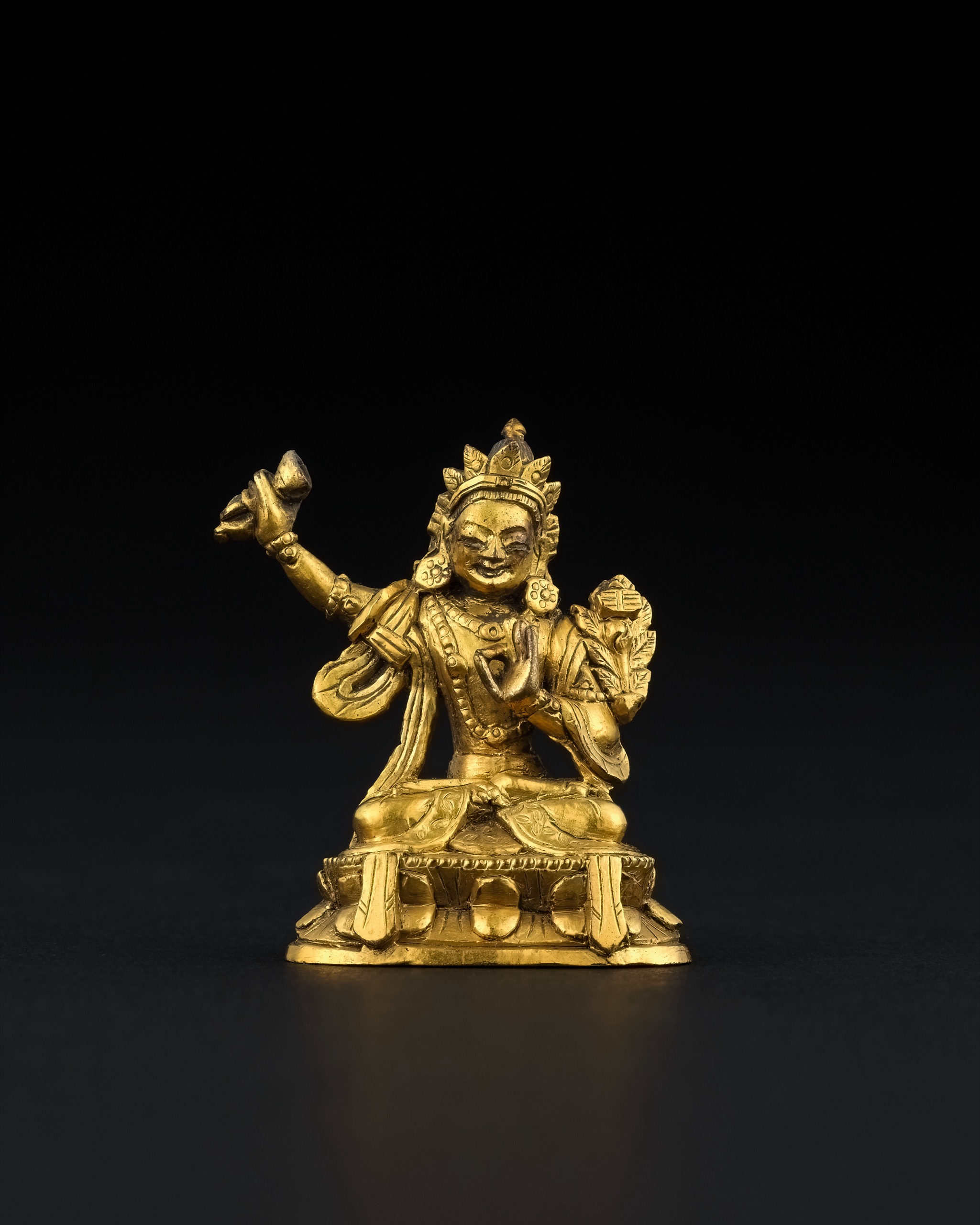 首頁 拍品總覽 2026迎春 share Lot. 1126 清 銅鎏金文殊菩薩 NT$ 80,000-120,000RMB¥ 16,000-24,000HK$ 20,000-30,000 媒材/尺寸 H3.6cm 來源 來源:木石居主人舊藏 賞析 文殊菩薩,鎏金光潤明淨,體量精巧,為典型隨身佛之制。菩薩神情專注,右手高舉智慧劍(已佚失),象徵斷除無明煩惱;左手當胸施予願印,並持蓮托經書,表智慧與慈悲並行。結跏趺坐於蓮座之上,衣紋流暢,瓔珞細密,造型緊湊而不失莊嚴。此類隨身佛多為高僧大德隨行禮敬之用,常置於嘎烏之中,或佩掛胸前,晨昏持誦,隨處觀想,象徵佛智常隨、慧光不離,兼具修持護佑之意。 登記競投 返回拍品列表 拍品推薦 1028 清 白玉鴛鴦 預估價:NT$ 120,000-180,000 2026迎春 1094 清 白玉馬上封侯帶扣 預估價:NT$ 100,000-150,000 2026迎春 1137 清雍正 五彩纏枝蓮紋三足筒式爐 預估價:NT$ 150,000-250,000 2026迎春 1144 清 龍紋抱柱毯 預估價:NT$ 150,000-250,000 2026迎春 1029 清 白玉豆莢 預估價:NT$ 50,000-80,000 2026迎春 1045 明 玉雕鶴銜壽桃 預估價:NT$ 100,000-150,000 2026迎春 1153 清 竹雕觀音菩薩 預估價:NT$ 30,000-50,000 2026迎春 1056 明 白玉雲龍紋帶板 預估價:NT$ 80,000-120,000 2026迎春 1119 清早期 雕漆松下高士圖臂擱 預估價:NT$ 200,000-300,000 2026迎春 1023 清 白玉喜字盤長形帶扣 預估價:NT$ 80,000-120,000 2026迎春