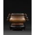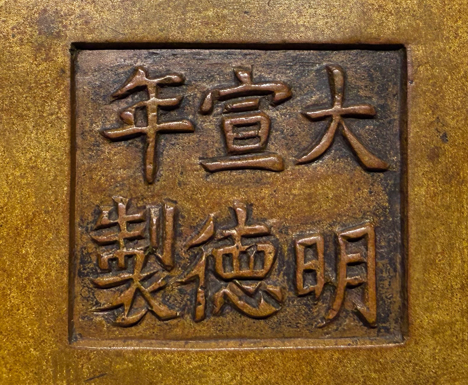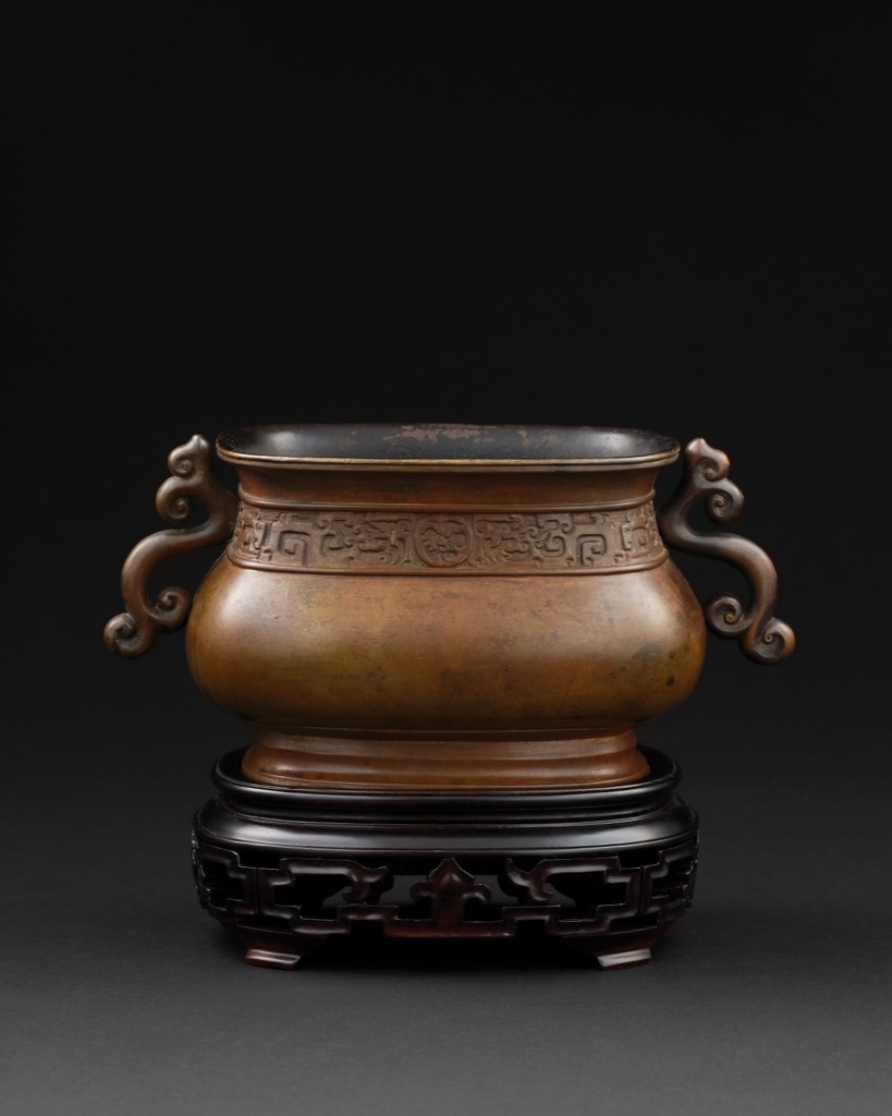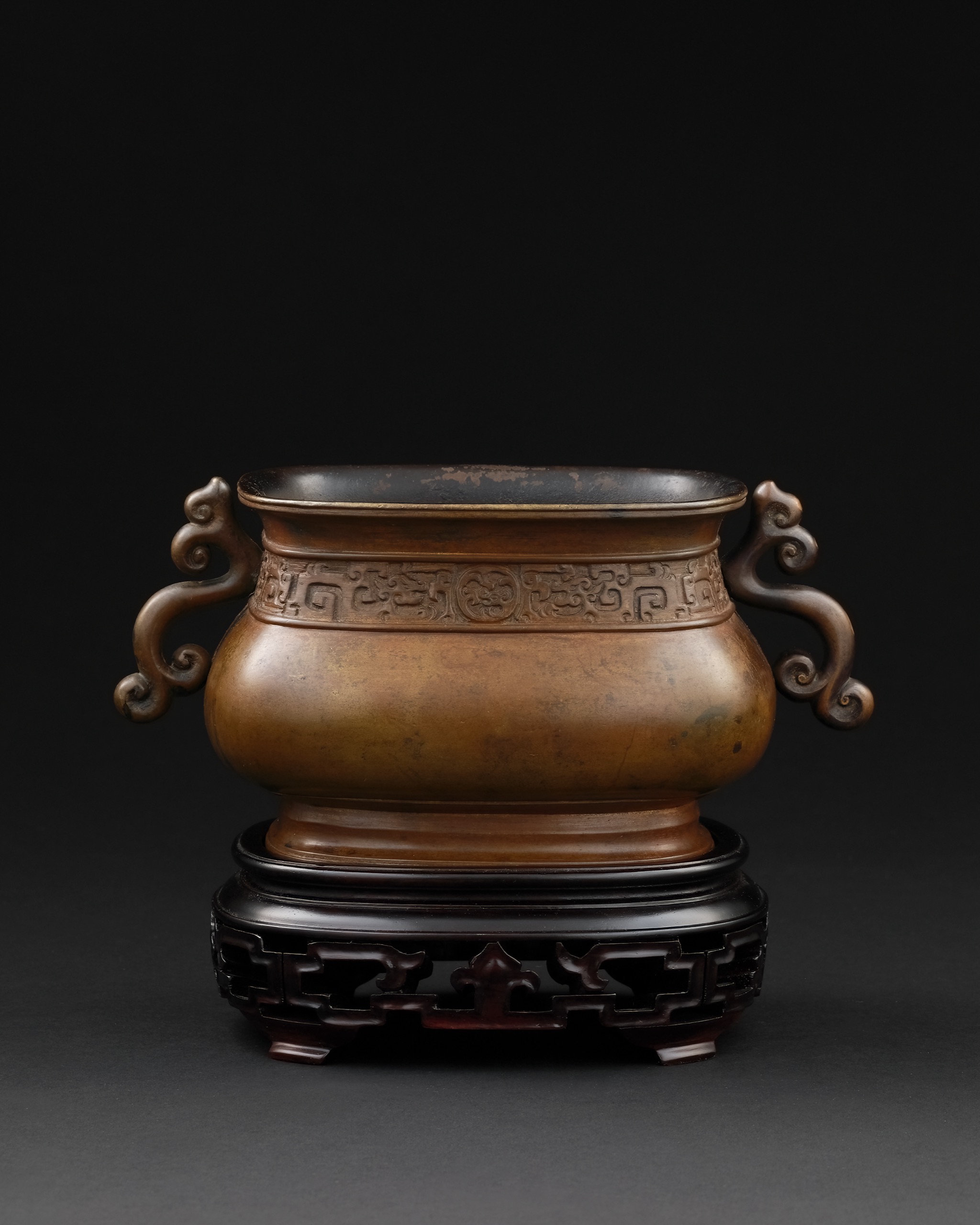 兩側爐耳作如意首形,上下銜接,呈S形曲勢外探,曲線婉轉而不失力度,轉折圓融,收放有致,與簋式鼓腹之形相互呼應,形成橫向穩重與縱向流動之對比。底心鑄方框陽文「大明宣德年製」六字款,字口俐落,筆畫勻整。綜觀其夔龍紋式與如意耳造型之組合,形制較為罕見,風格特徵與乾隆朝仿古銅作相契。