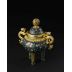 此件掐絲琺瑯蓋爐,結構嚴整,通體以紅銅為胎,分為蓋、爐、耳、足四部分。爐蓋作覆缽形,高隆挺拔,頂飾鎏金鏤雕雲蝠紋寶珠鈕,球體透雕蝙蝠、祥雲與花葉紋,繁縟細膩,鈕下飾覆蓮瓣一周,承接穩妥,頗為華美。