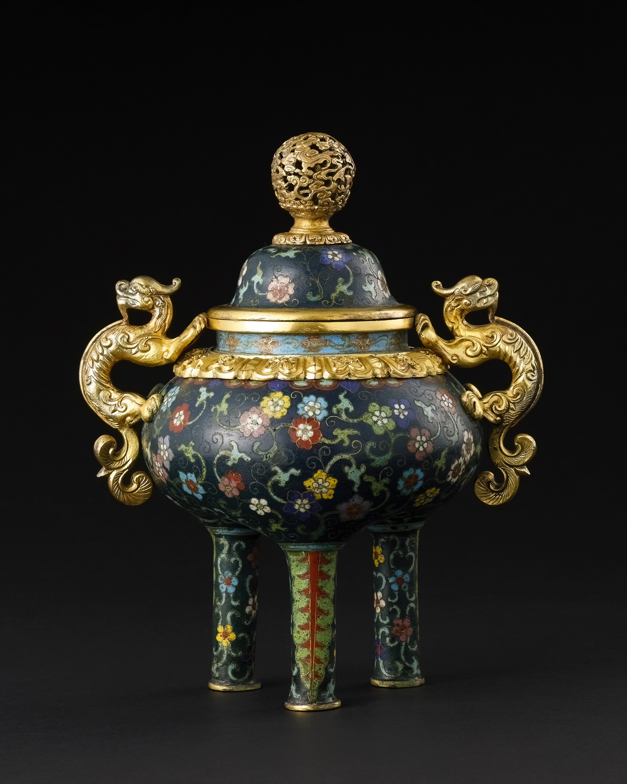 全器通體施掐絲琺瑯工藝,配合鎏金、鏤雕與立體構件之結合。紋飾講究,技藝精湛,雍容華麗,為清中期宮廷所製之香具,集禮佛、清供與陳設之用於一體,為造辦處典型器作。