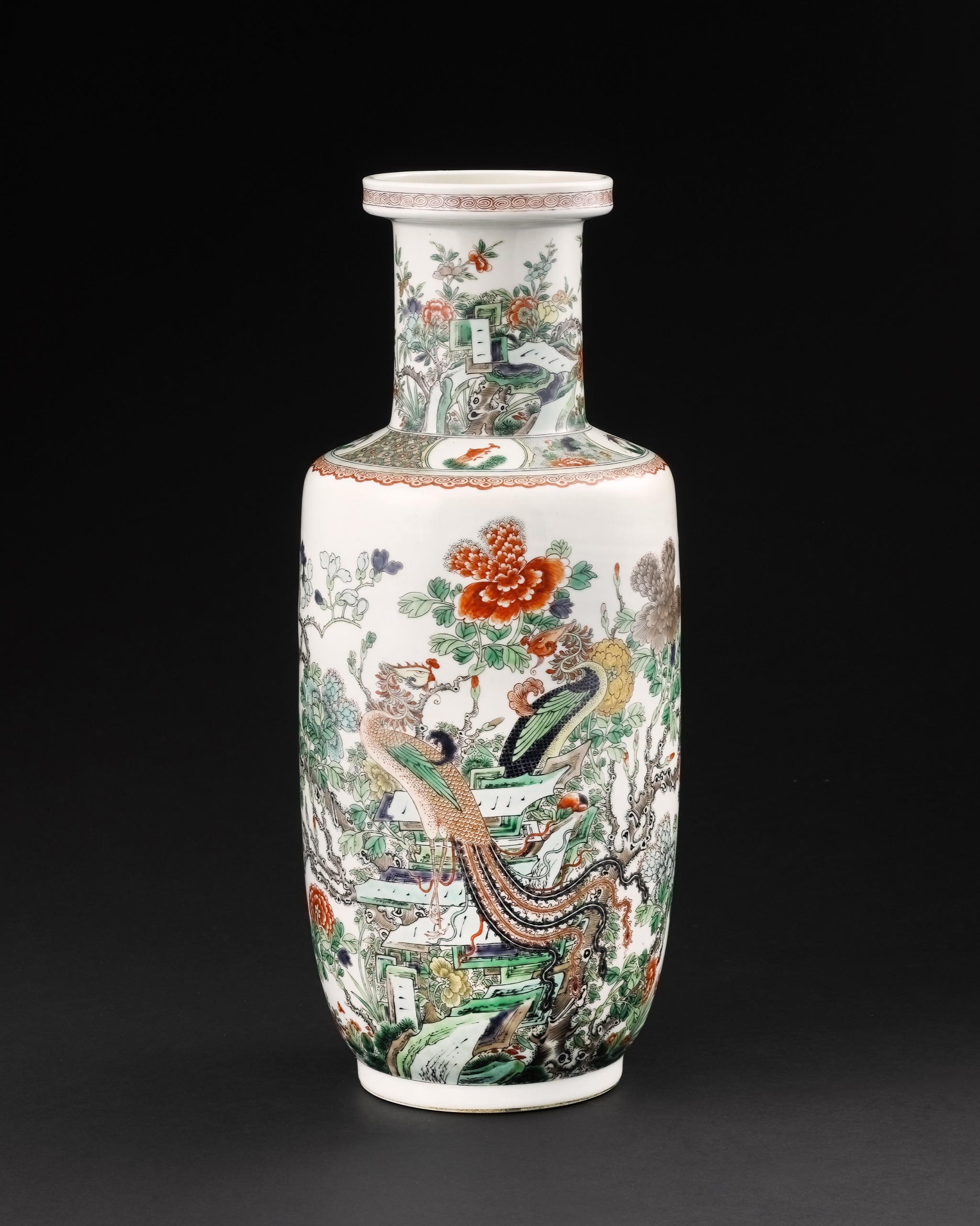 瓶身通景繪牡丹鳳凰圖。雙鳳分立花間,一施赭紅,一飾青翠,羽翼層層鋪展,尾羽低垂如流雲曳地,姿態雍容。牡丹盛放,花瓣以濃淡設色層層暈染,枝葉穿插掩映,繁麗而不失秩序;間飾梔子、水仙與雙鵲,寓意層層遞進。鳳為百鳥之長,象徵祥瑞;牡丹為花中之王,寓意富貴,交映成「富貴吉祥」之象。頸部桃花與奇石相間,筆意靈動;肩部開光內繪金魚、蝦與水景花卉,間以錦地紋樣穿插,章法周密,色彩明快而節制,灑脫中見法度。