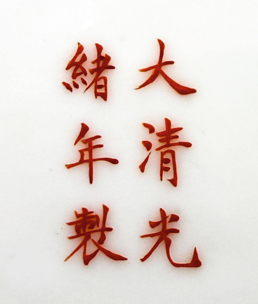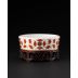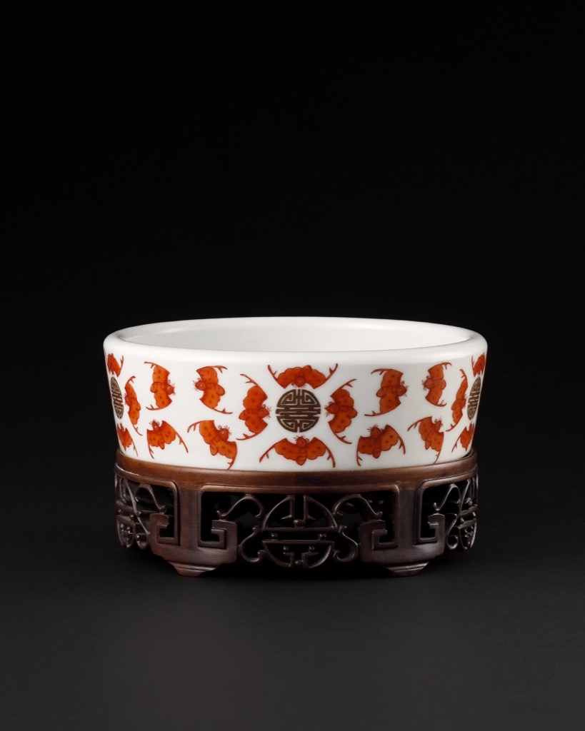 此件清光緒礬紅彩福壽雙全紋洗,器形敞口微撇,弧腹下收,平底無圈足,底承寬博砂胎,修削平整,見旋削痕跡。胎質潔白細緻,釉面光潤勻淨,內壁滿施白釉,素雅澄澈。外壁以礬紅彩繪群蝙蝠,展翅翻飛,姿態生動,筆觸流暢而層次分明;間飾描金團壽字,金彩光瑩,與礬紅相互映襯,寓「福壽雙全」之美意。底心書「大清光緒年製」六字雙行礬紅楷款,字體端整。配老紅木透雕座,鏤刻團壽紋,與器身紋飾相呼應,陳設莊雅而寓意吉祥。