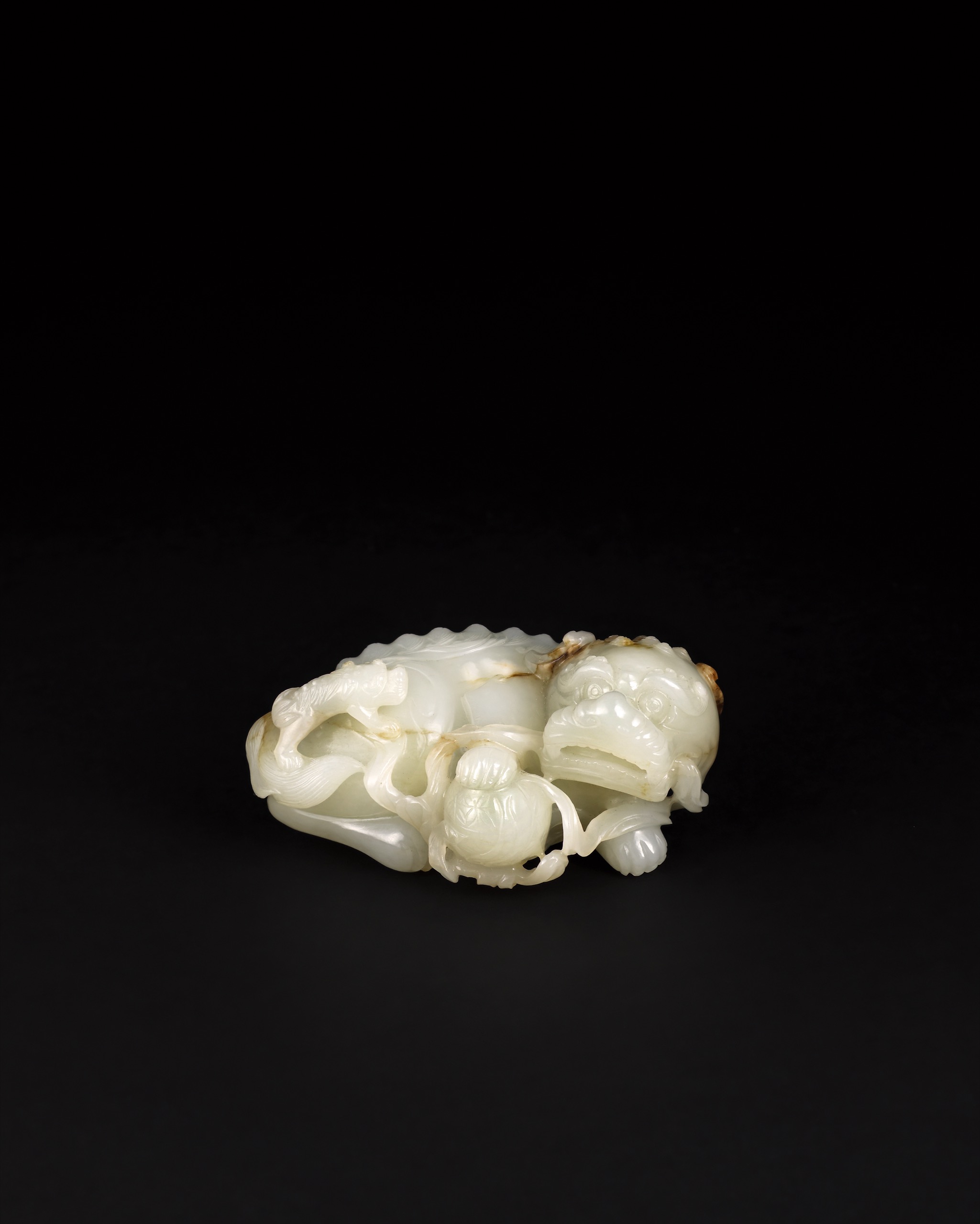 此件白玉圓雕太獅少獅擺件,整料雕成。玉質呈乳白色,局部帶黃褐沁斑,分布於獅首與尾端。太獅伏臥回首,雙目圓睜,鼻梁隆起,口微張露齒;鬃毛以卷紋陰刻,沿頸背鋪展,一足前伸踏繡球,形成視覺重心。少獅攀附其側,前爪搭於太獅身上,體量縮小,與主體構成前後層疊。肢體間施以鏤空,使軀幹與四肢形成穿插關係,尾部內卷收束輪廓。