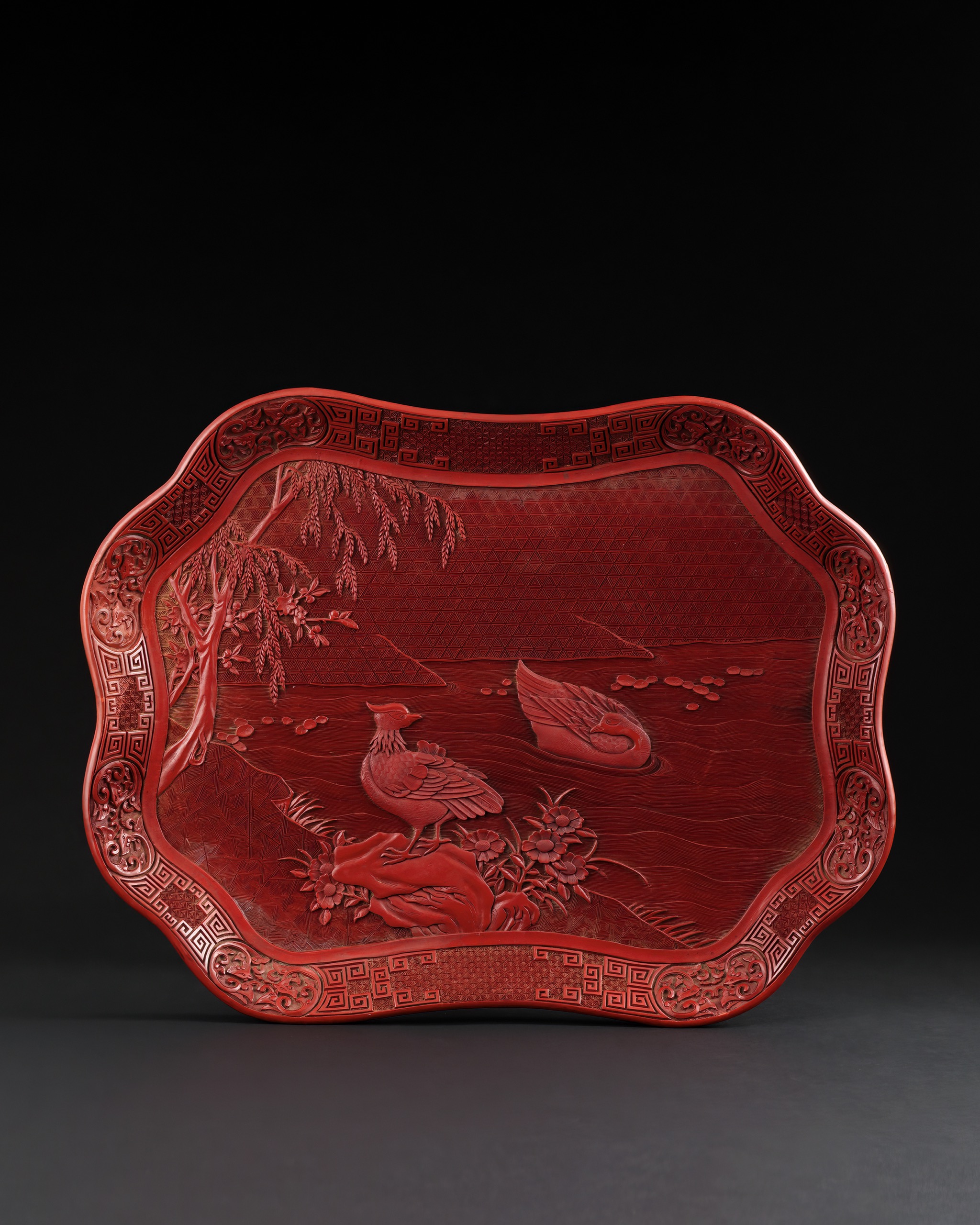 首頁 拍品總覽 2026迎春 share Lot. 1152 清 剔紅柳塘鴛鴦紋盤 NT$ 30,000-50,000RMB¥ 6,000-10,000HK$ 7,500-12,500 媒材/尺寸 L39cm 來源 來源:北京保利 2008.12.06 lot.2982 賞析 此盤作花口長方形,四邊起伏,輪廓流暢。通體髹朱漆,層層堆漆後再雕刻。盤沿飾回紋與錦地紋樣,轉角設開光,內刻夔鳳紋。盤內以錦紋為地,浮雕水岸景致:垂柳臨水,桃花綻放,水面刻波紋與浮萍,一對鴛鴦分處水陸。花葉與禽鳥刻畫清晰,層次分明。背面髹黑漆,漆面平整,中央可隱見款磨痕。 登記競投 返回拍品列表 拍品推薦 1033 清 白玉太師少師 預估價:NT$ 150,000-250,000 2026迎春 1009 清 白玉和合二仙牌 預估價:NT$ 120,000-180,000 2026迎春 1051 明 青玉鏤空龍紋帶扣 預估價:NT$ 100,000-150,000 2026迎春 1140 明末清初 紫砂橄欖壺 預估價:NT$ 220,000-280,000 2026迎春 1084 明 白玉鏤雕歲歲平安嵌飾 預估價:NT$ 80,000-120,000 2026迎春 1131 明末清初 纏枝蓮紋如意耳象足方爐 預估價:NT$ 200,000-300,000 2026迎春 1138 清光緒 礬紅彩福壽雙全紋洗 預估價:NT$ 250,000-400,000 2026迎春 1122 明 銅鎏金文官坐像 預估價:NT$ 250,000-350,000 2026迎春 1060 明 白玉龍紋帶板 預估價:NT$ 80,000-120,000 2026迎春 1085 明 白玉鏤雕牡丹紋嵌飾 預估價:NT$ 120,000-180,000 2026迎春