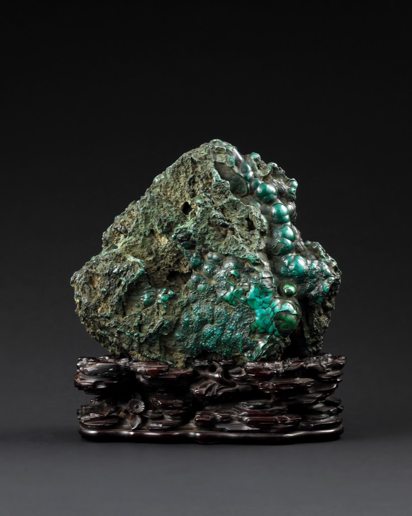 首頁 拍品總覽 2026迎春 share Lot. 1157 清 孔雀石隨形山子 NT$ 30,000-50,000RMB¥ 6,000-10,000HK$ 7,500-12,500 媒材/尺寸 H18cm 來源 來源:浙江世貿 2014.11.09 lot.86 賞析 孔雀石山子,依石勢自然起伏,峰巒層疊,孔穴嶙峋。石表凝結葡萄狀結晶,翠綠濃豔,深淺交織,局部呈圓珠般聚集,質感豐富。整體形態渾厚蒼勁,富山岳之勢,配以雕木座承托,更顯穩重。孔雀石為含銅碳酸鹽礦物,因色澤翠綠如孔雀羽而得名。古來中國雲南、大冶及甘肅等地均有產出。其色彩鮮明,多作觀賞石或顏料之用,歷來為文房清供之雅石。 登記競投 返回拍品列表 拍品推薦 1042 清 白玉福祿萬代 預估價:NT$ 80,000-120,000 2026迎春 1044 清 白玉伏虎羅漢 預估價:NT$ 120,000-180,000 2026迎春 1148 清 白玉鉤雲紋璧 預估價:NT$ 100,000-150,000 2026迎春 1012 清 白玉素環 預估價:NT$ 100,000-150,000 2026迎春 1059 明 白玉鏤雕雲鶴紋帶板 預估價:NT$ 150,000-250,000 2026迎春 1099 清 白玉鏤雕龍紋扳指 預估價:NT$ 60,000-80,000 2026迎春 1024 清 白玉螭龍紋盤長形帶扣 預估價:NT$ 80,000-120,000 2026迎春 1108 清乾隆 白玉寶相花紋圓盒 預估價:NT$ 600,000-1,200,000 2026迎春 1083 元/明 白玉雁紋帶飾 預估價:NT$ 120,000-180,000 2026迎春 1110 清乾隆 御製銅胎掐絲琺瑯鏤空象鈕葵形大薰爐 預估價:NT$ 5,000,000-8,000,000 2026迎春