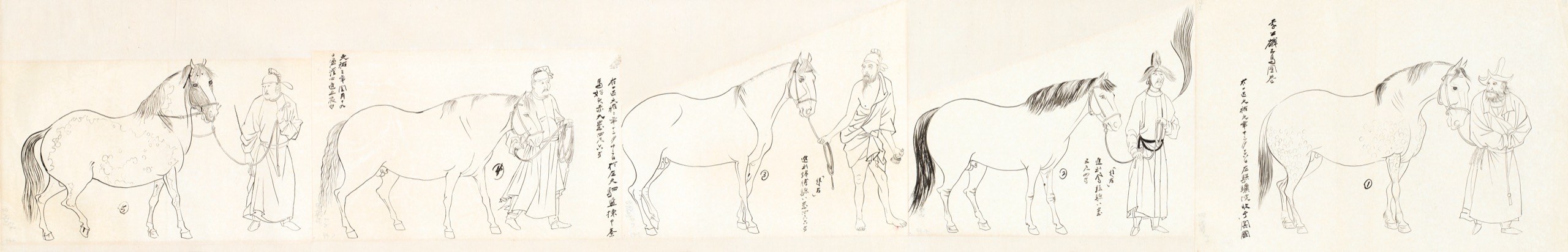 李公麟五馬圖卷。右一匹元祐元年十二月十六日,左騏驥院收于闐國。進到鳳頭驄八歲,五尺四寸。進到錦膊驄八歲,四尺六寸。右一匹元祐二年十二月廿三日,於左天駟監,揀秦馬好頭赤九歲,四尺六寸。元祐三年閏月十九日,溫溪心進照夜白。