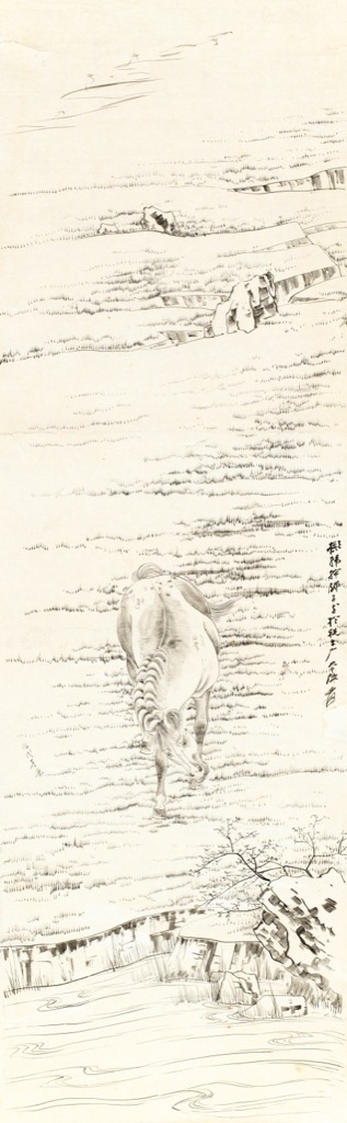 最可貴者, 此粉本與佳士得香港2024 年春拍以1247.5 萬港元天價成交之《仿宋人劉永年烏騮圖》(99x47.5cm)為同一題材、同一母本。該作1945 年