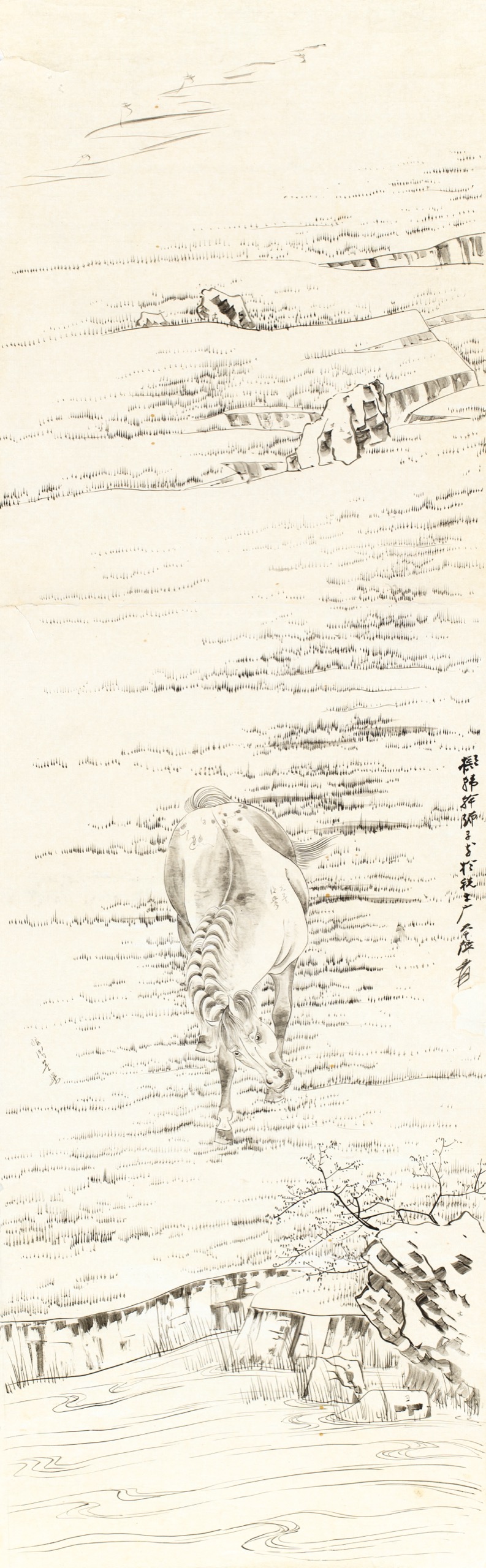 此幀為張大千「稅牛厂」時期所繪《擬韓幹師子花》粉本,尺幅128x40cm,款識「擬韓幹師子花於稅牛厂,大千張爰」。粉本者,畫家構思經營之草稿,亦是創作軌跡之見證,於研究大千藝術尤為珍貴。