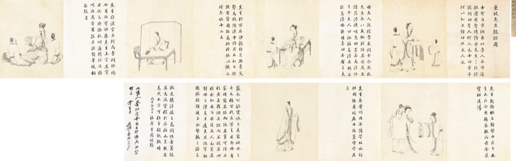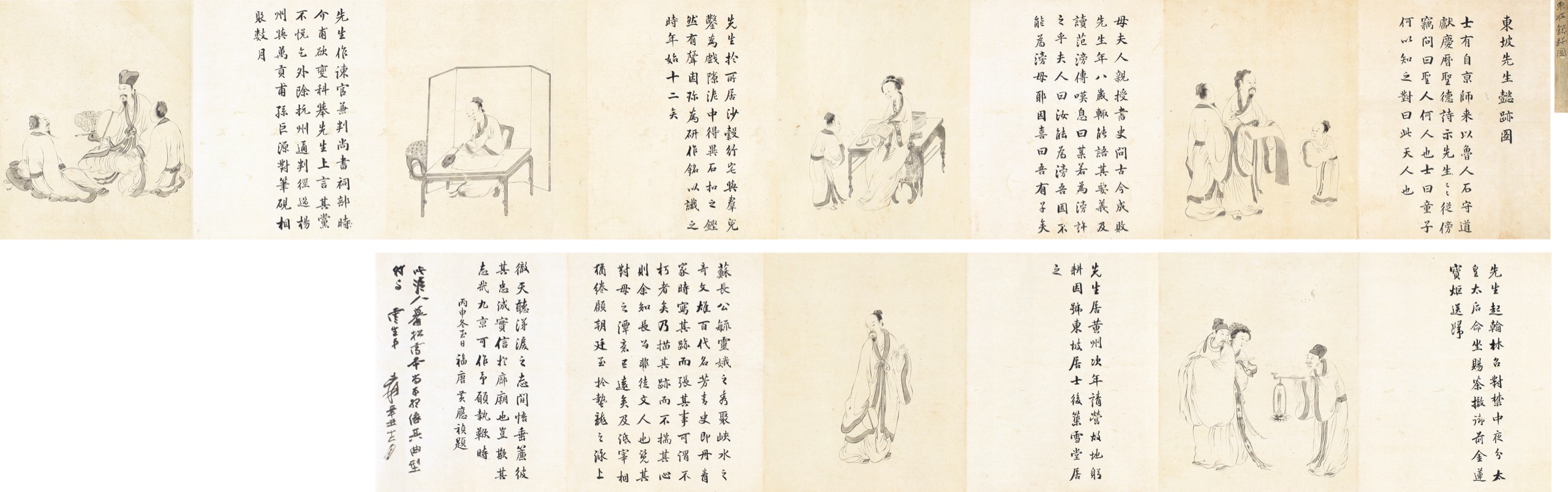 簽條:東坡懿跡圖東坡先生懿跡圖:士有自京師來,以魯人石守道,獻慶曆聖德詩示先生,先生從傍竊問曰:聖人何人也?士曰:童子何以知之?對曰:此天人也。母夫人親授書史,問古今成敗。先生年八歲輙能語其要義,及讀范滂傳,嘆息曰:某若為滂許之乎?夫人曰:汝能為滂,吾固不能為滂母耶?因喜曰:吾有子矣!先生於所居沙穀行宅,與羣兒鑿為戲,隙泥中得異石,扣之鏗然有聲,因珍為研作銘以識之,時年始十二矣。先生作諫官兼判尚書祠部,時介甫欲變科舉,先生上言,其黨不悅,乞外除杭州通判,徑過楊州與萬貢甫、孫巨源,對筆硯相聚數月。先生起翰林,召對禁中,夜分。太皇太后命坐賜茶,撤御前金蓮,寶炬送歸。先生居黃州,次年請營故地躬耕,因號東坡居士,後築雪堂居之。蘇長公毓靈娥之秀,聚峽水之奇,文雄百代、名芳青史。即丹青家時寫其跡,而張其事,可謂不朽者矣。乃描其跡而不揣其心,則余知長公非徒文人也。覽其對母之潭意已遠矣,及詆宰相猶綣顧朝廷,至於蟄龍之詠,上徹天聽,涕淚之志,間悟垂簾,彼其忠誠實信於廊廟也,豈欺其志哉?九京可作予願執鞭時。丙申冬至日,福唐黃應禎題。張大千跋:此清人摹松雪本,尚可想像其曲型。付與雲生弟,爰辛丑十二月。