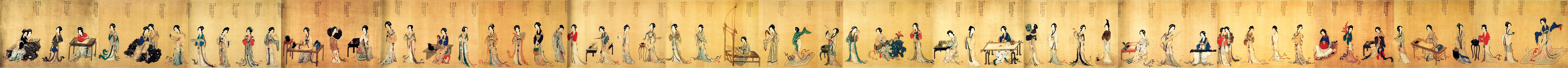 仇英(約1497-1552)字實父,號十洲,明四家之一,尤擅人物仕女,既工設色,又善白描,能運用多種筆法表現不同對象,「或圓轉流美,或勁麗豔爽」。其《千秋絕豔圖》原跡(一說藏中國歷史博物館,無款;一說日本早稻田大學藏有白描底本《佳婦人例圖》),在6米餘長卷中匯集自秦漢至明代歷代著名女性近70位——從西施、王昭君、趙飛燕、楊貴妃,到謝道韞、蘇小小、李清照、薛素素,可謂一部「形象的歷代才女譜」。