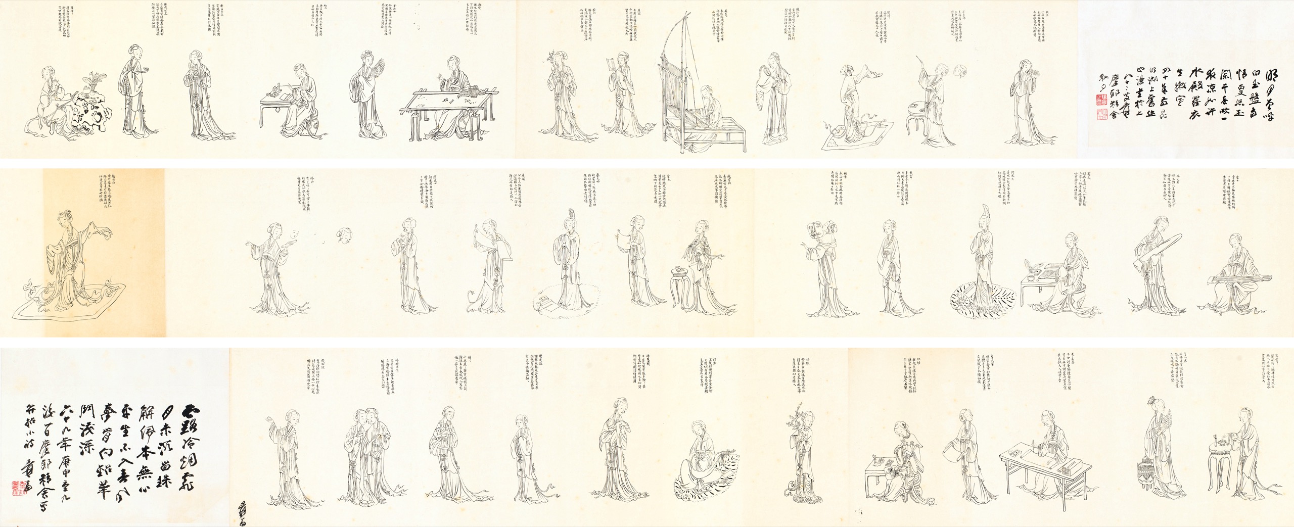 此卷為大千先生臨明代仇英《千秋絕豔圖》之粉本,全長6 米餘,純以水墨白描寫成,乃其「血戰古人」階段之重要遺存。雖曰粉本,實則畫心之外,更附大千82 歲高齡於摩耶精舍先後補題二詩,詩畫相映,彌足珍貴。