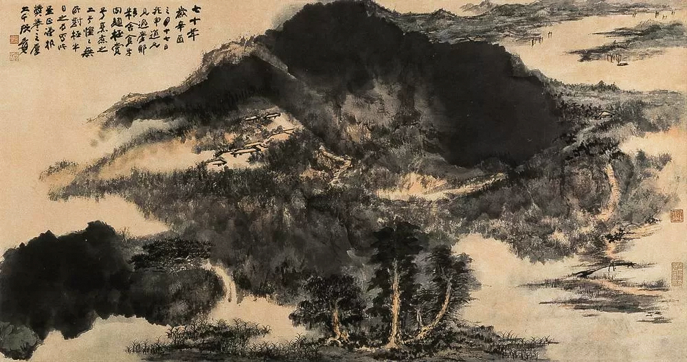全幅不施丹青,純以墨色為之,不假色彩。這正是檢驗畫家潑墨功力的試金石——必須僅憑墨色的濃淡乾溼、滲化控制,來表現山川的體積、空間與氣韻。觀此作,墨瀋淋漓處元氣充沛,筆墨收拾處精神凝聚,可謂杜甫「元氣淋漓障猶濕」的千年回響。