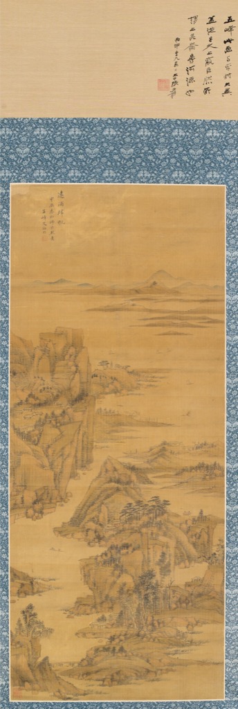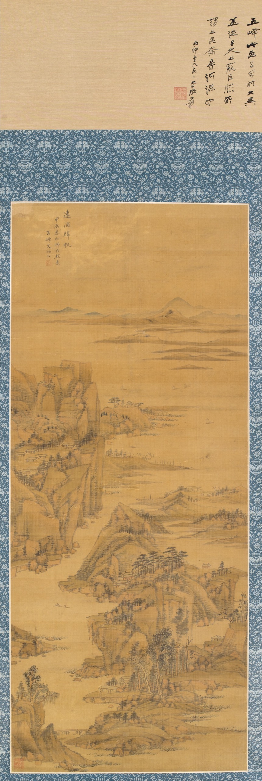 一、 款識鈐印與師承溯源款識:「遠浦歸帆,甲辰春和師巨然意。五峰文伯仁。」鈐印:「五峯」、「師巨然意」明確揭示文伯仁直溯五代南派山水鼻祖巨然的創作意圖,突破吳門家學藩籬‧甲辰正值文伯仁藝術風格融匯宋元、自成面貌的關鍵時期,此作可見其深入傳統的功力。