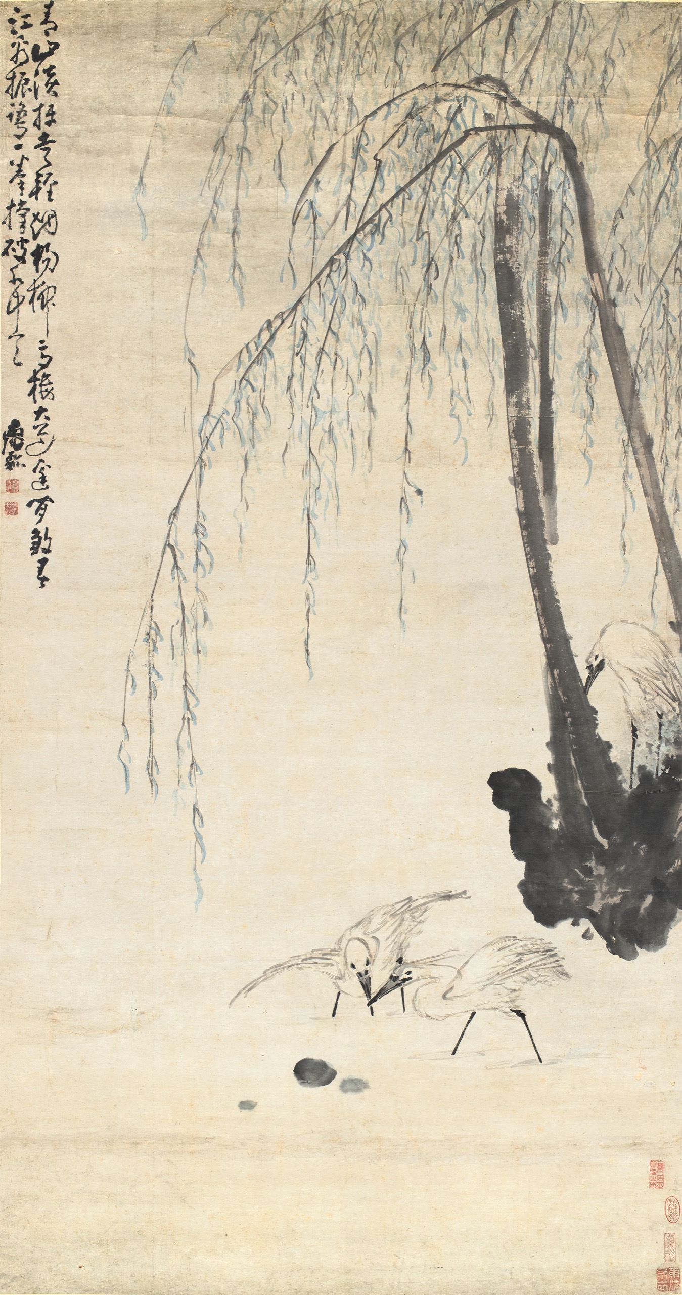 黃慎「三鷺三柳」逸品驚豔亮相。癭瓢以草書入畫,寫白鷺爭食、伺魚之趣:二鷺嘴喙相交,生機盎然;一鷺靜立柳下,動靜皆藏天機。左上兩行狂草題「青山淡抹走輕煙⋯一拳撐破水中天」,運筆縱橫跌宕,與畫意相生。鈐「黃慎」、「癭瓢」、「東海布衣」三印。清晚期雙色綾裱,古雅宜人。此作構圖奇絕,三鷺三柳呼應成趣,足見「詩書畫三絕」神髓。2026年3月,敬請眾家法眼共賞此幅「一拳撐破水中天」之力作。