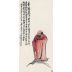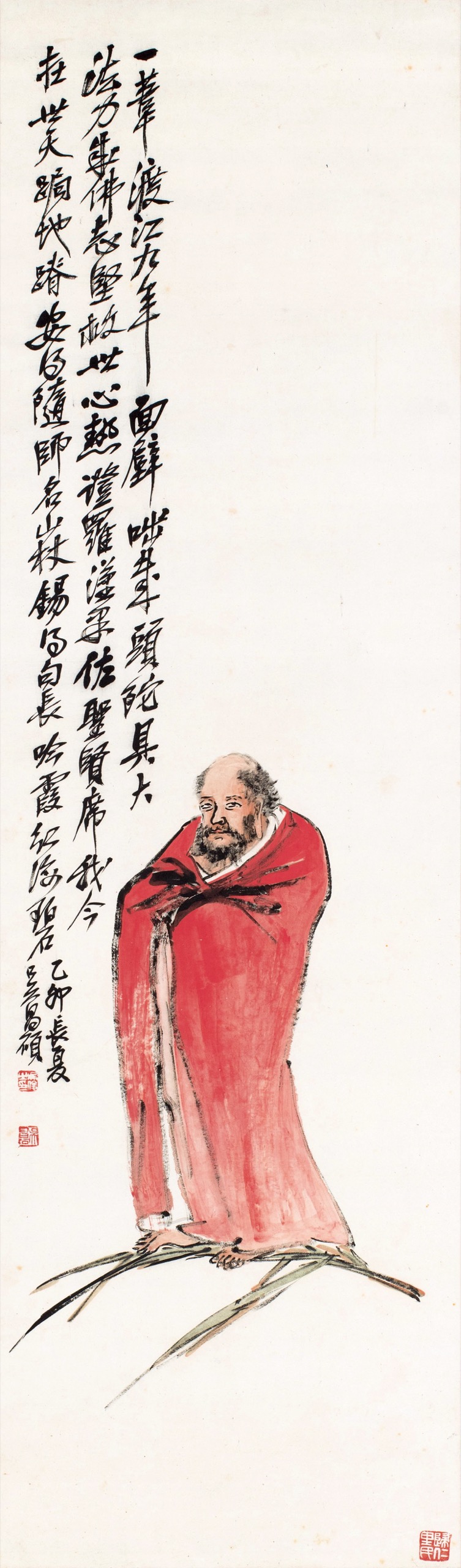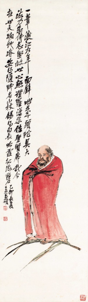 達摩身披大紅袈裟,足踏一葦,凌波渡江。江面以大片留白示水天浩蕩,白愈闊,行愈孤,祖師步履之堅決愈見分明。蘆葦輕細,卻承載一身風骨;大江無際,反襯出「直渡」的膽識。缶翁寫衣紋尤見金石味,中鋒行筆,線條沉著,提按有致,剛勁峻拔,氣息沿線而行。紅衣設色厚薄濃淡富層次,烘托出這一身袈裟的精神重量。達摩面相以寥寥數筆寫眉骨、鼻樑、顴頰之起伏,雙目炯然,光而不怒,直視前方,如已照見彼岸;鬚髮以枯筆飛白略點,蒼勁而帶散逸,兼具行旅風塵與禪者清峻。其妙在於以簡攝神:形體略具而神采自足,與其說在紙上塑像,不如說於筆端立氣。祖師的堅毅與超脫,自成凜然。