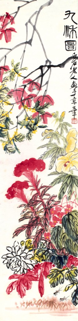 《九秋圖》的題材取自民間「九秋同慶」的吉祥語,象徵秋季的豐盈與圓滿。白石一生不愛文人悲秋的蕭瑟,他曾題秋花:「愁風苦雨香還溢,冶露嚴霜色更佳。」這種明快向上的情緒,正是其獨特人生態度的寫照。