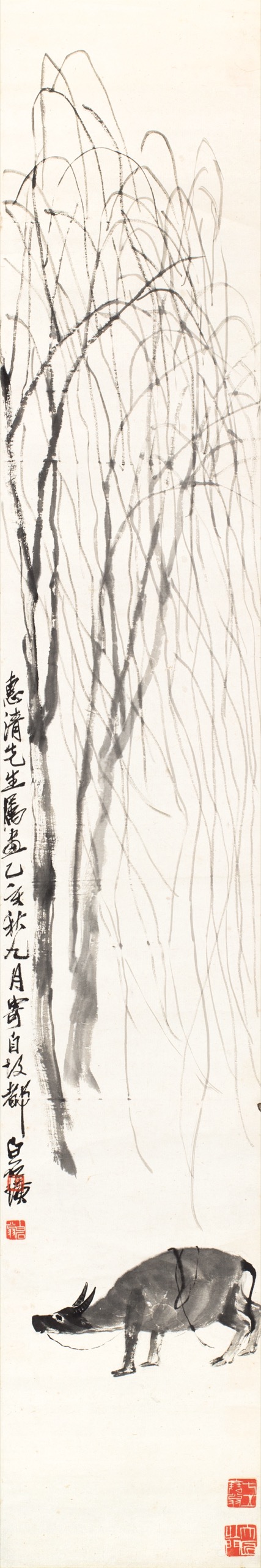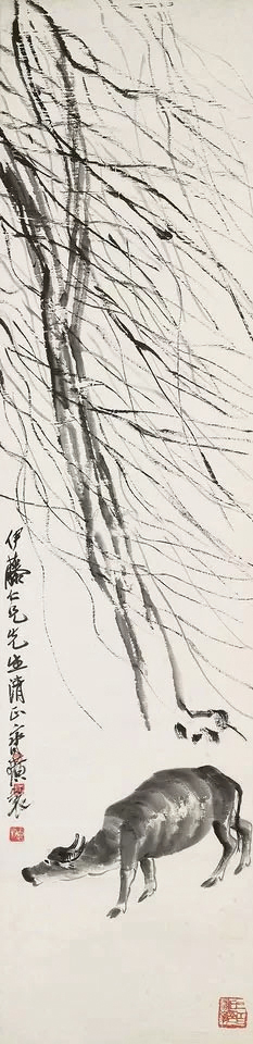 齊白石《柳蔭水牛圖》以農村常見的水牛為主題,構圖簡潔,描繪了一頭水牛在柳樹下靜立的情景。畫面水牛橫立於畫面下方,正伸著脖子、弓著脊背,牛身以濃淡墨塊渲染,既表現了水牛的體積也增添層次感,突出質樸之感。牽牛繩以濃墨鈎描,從牛鼻繞過牛身垂下,顯得自然而隨意。齊老以淡墨書寫出後方二株柳樹經微風吹拂,絲絲搖動吹垂的柳枝,足見書法線條功力,充滿了動感與韻律,為畫面增添了生機與詩境。水牛是齊白石筆下常見的題材,與其兒時牧牛生活之心靈記憶相繫,象徵著勤肯、樸實與鄉土情懷。柳樹之「柳」與「留」諧音,古人送別時折柳贈別,有著「挽留」之意,也用來表達依依不捨的惜別之情。兩者結合既展現了農村生活的自然氣息,或也傳遞出齊老對過往少時田園生活的懷想與追念。現今能於臺灣寶島還能見到1935 年的齊老柳蔭水牛生貨,真可謂是市場鑽石級的拍品,極為難得。查閱市場有關白石老人所繪水牛題材的作品,2011年香港佳士得拍賣公司秋拍,上拍齊白石1937年作柳蔭牧牛圖(圖1),拍出港幣542萬成交價,另2006年中國嘉德拍賣公司春拍齊白石放牛圖(圖2),拍出人民幣1,705,000元的高成交價,另外2015年香港蘇富比拍賣公司秋拍,齊白石柳牛立軸(圖3),拍出港幣584萬元的高成交價。可證市場對齊白石的「水牛」系列相當強手,亦是稀缺物件。今於帝圖迎春拍呈現敬乞諸方家多予競投。
