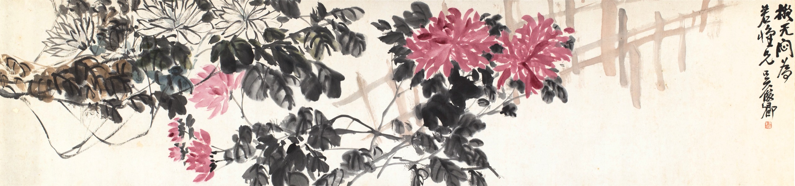 此幅吳昌碩(俊卿)早年《擬無悶菊園圖》橫幅,款識「擬無悶為若懷兄」,乃缶翁研習趙之謙(無悶)金石畫風之難得佳例。全幅以左起白菊、紅菊依次鋪陳,短籬橫亘,極見經營之妙。昌碩此期深得悲盦神髓,菊枝以篆隸之筆寫就,蒼勁如「屋漏痕」,短籬更以帶隸書波磔之意筆草草寫出,古拙中見金石氣息;設色則濃麗古豔,紅菊厚重如硃砂,白菊以淡墨襯托,對比鮮明而不掩墨韻。全卷布局由左向右開展,短籬橫向切割與菊枝縱橫穿插形成節奏動勢,平中見奇,已見日後雄渾老辣之雛形。