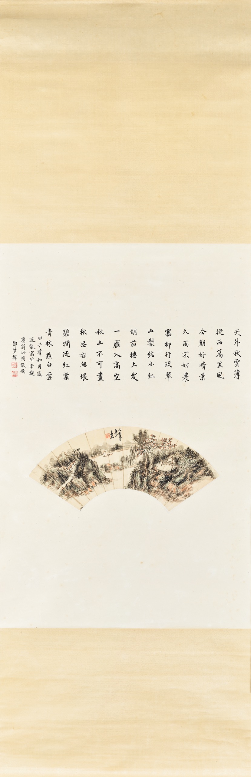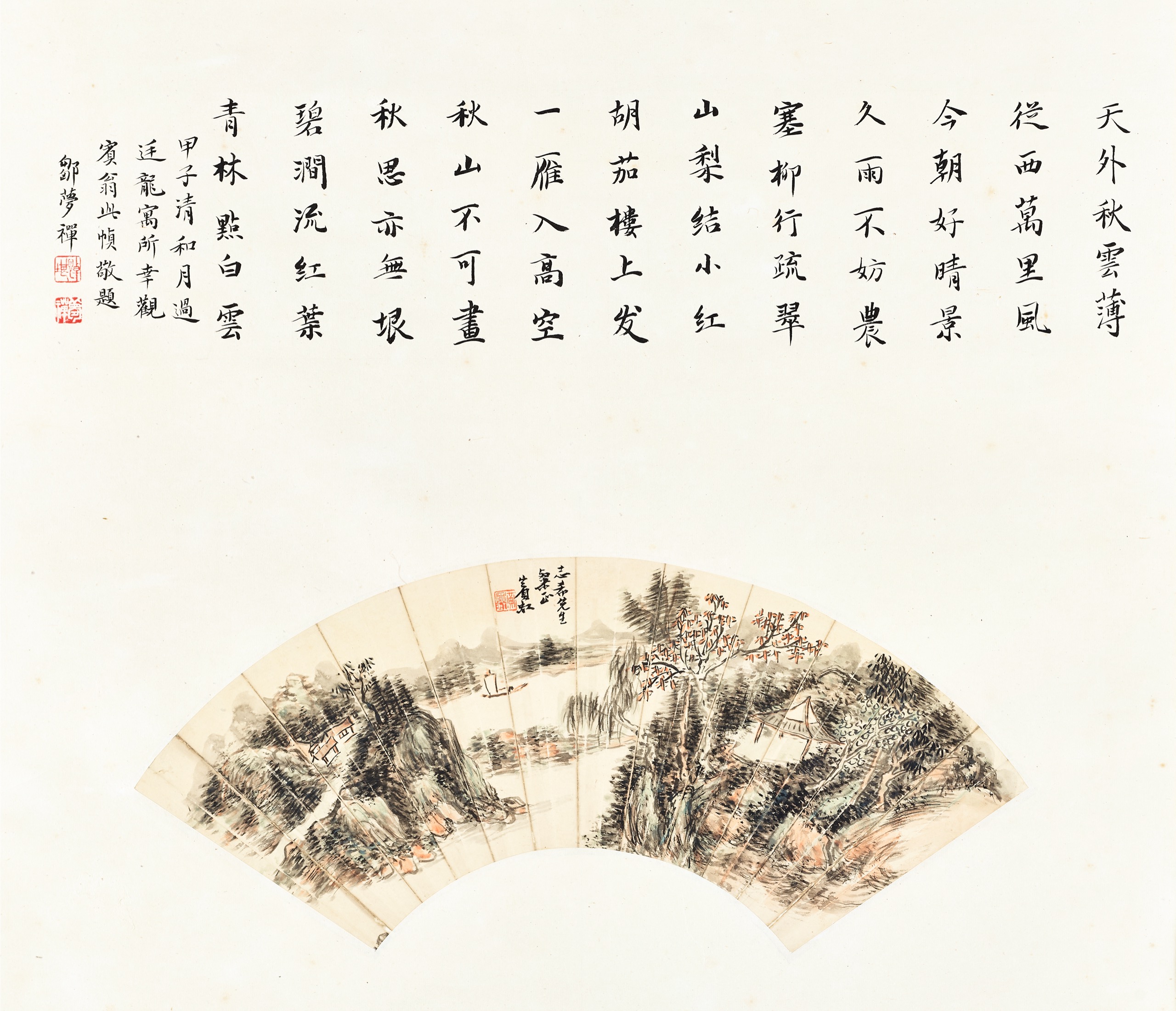 首頁 拍品總覽 2026迎春 share Lot. 3049 黃賓虹、鄒夢禪Huang Bin-Hung、Tzou Meng-Chan 1865-1955、1905-1986 秋山雲林 NT$ 500,000-800,000RMB¥ 100,000-160,000HK$ 125,000-200,000 媒材/尺寸 立軸 設色 紙本, L:44cm 款識 天外秋雲薄,從西萬里風。今朝好晴景,久雨不妨農。塞柳行疏翠,山梨結小紅。胡茄樓上发,一雁入高空。秋山不可畫,秋思亦無垠。碧澗流紅葉,青林點白雲。甲子青和月過廷龍寓所,幸觀賓翁此幀敬題,鄒夢禪。志希先生粲正,賓虹。 鈐印 悼堪(朱)、夢禪(白)。黃賓虹(朱白)。 登記競投 返回拍品列表 拍品推薦 3018 張大千 熊、蟋蟀圖、寫生翎毛圖 (三件一組) 預估價:NT$ 50,000-100,000 2026迎春 3107 溥心畬 簽名照 (張大千、溥心畬、董作賓、張默君) 、 溥心畬、張默君 (書法) 預估價:NT$ 80,000-120,000 2026迎春 3004 孫雲生 潑彩山水 預估價:NT$ 5,000-10,000 2026迎春 3203 拓本、江兆申(題) 禮器碑拓本兩冊 預估價:NT$ 80,000-120,000 2026迎春 3075 吳子深、馬壽華 山水、四君子冊頁 預估價:NT$ 60,000-80,000 2026迎春 3334 張之溶 百駿圖 預估價:NT$ 200,000-300,000 2026迎春 3019 張大千 擬韓幹師子花 預估價:NT$ 50,000-100,000 2026迎春 3160 于右任 草書條幅 預估價:NT$ 150,000-250,000 2026迎春 3009 張大千 臨宋李公麟五馬圖 預估價:NT$ 50,000-100,000 2026迎春 3297 趙樸初等大德 書法十開(日中平和觀光友好訪中團名簿) 預估價:NT$ 80,000-120,000 2026迎春