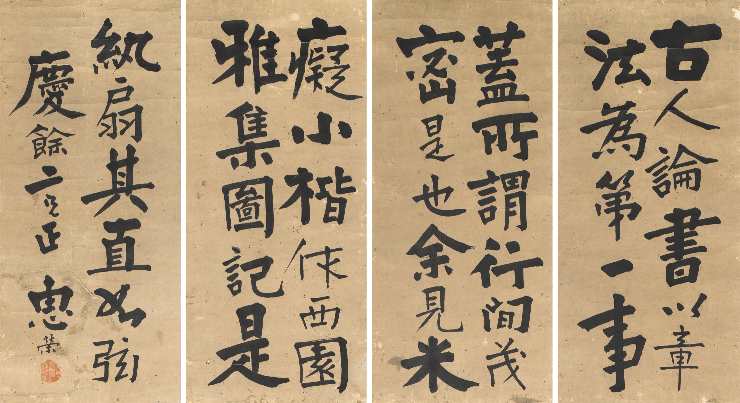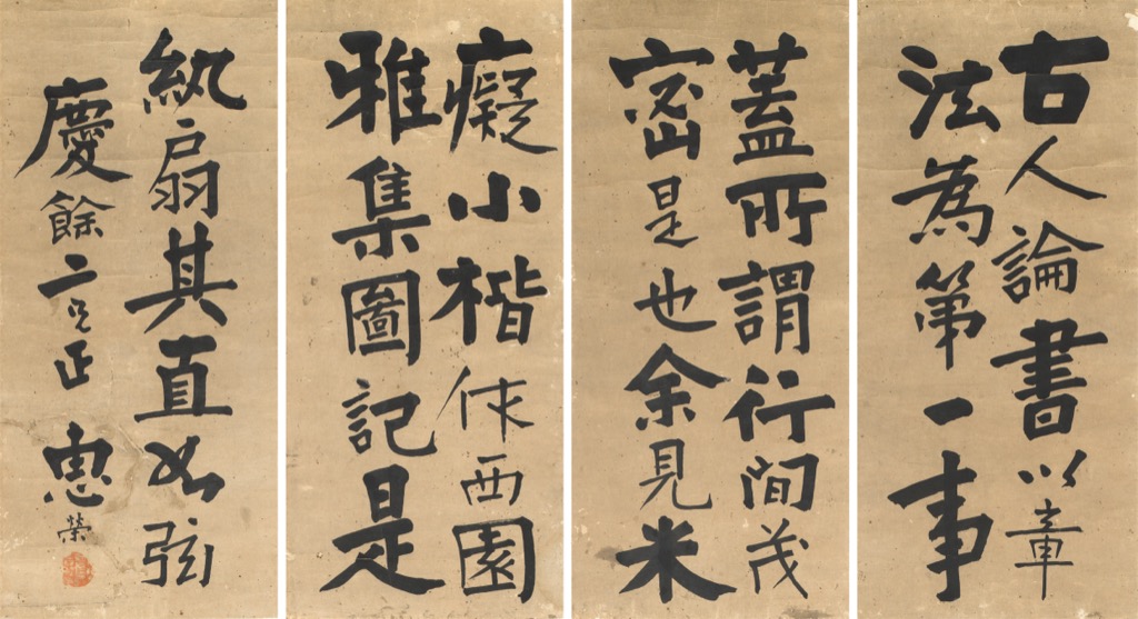 首頁 拍品總覽 2026迎春 share Lot. 3084 惠榮Huei Rung 1849-? 楷書節錄董其昌《畫禪室隨筆》四屏 NT$ 40,000-60,000RMB¥ 8,000-12,000HK$ 10,000-15,000 媒材/尺寸 立軸 水墨 紙本, 65.5x29.5cmx4 款識 古人論書,以章法為第一事。蓋所謂行間茂密是也。余見米癡小楷,作西園雅集圖記,是紈扇,其直如弦。慶餘二兄正,惠榮。 鈐印 漫漶不辨。 賞析 惠榮字師僑,漢軍正黃旗人,光緒3年3甲11名進士。工書,書法顏真卿。同治年間任寧夏知府。 登記競投 返回拍品列表 拍品推薦 3243 傅申 日進斗金 預估價:NT$ 5,000-10,000 2026迎春 3176 詹景鳳 草書七言立軸 預估價:NT$ 200,000-300,000 2026迎春 3021 張大千 《臨明仇英千秋絕豔圖》 預估價:NT$ 1,200,000-2,000,000 2026迎春 3002 孫雲生 荷花圖 預估價:NT$ 5,000-10,000 2026迎春 3355 徐操(米景揚題)、來楚生 仕女冊頁(9開)、花鳥( 二件一組) 預估價:NT$ 50,000-80,000 2026迎春 3164 于右任 草書陽明白灣詩 預估價:NT$ 120,000-160,000 2026迎春 3127 江兆申 柴門夕趣 預估價:NT$ 200,000-300,000 2026迎春 3170 于右任 草書五言聯 預估價:NT$ 120,000-160,000 2026迎春 3144 于右任 草書五言聯 預估價:NT$ 120,000-160,000 2026迎春 3132 吳子深 墨竹圖 預估價:NT$ 30,000-50,000 2026迎春