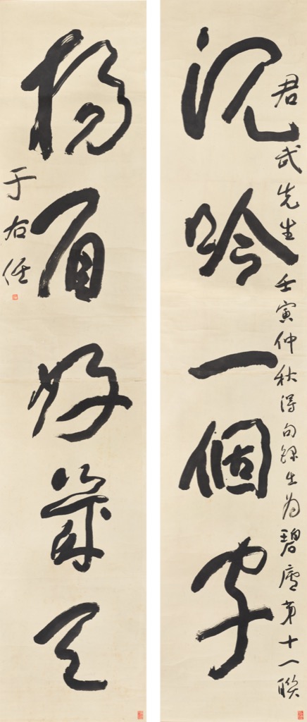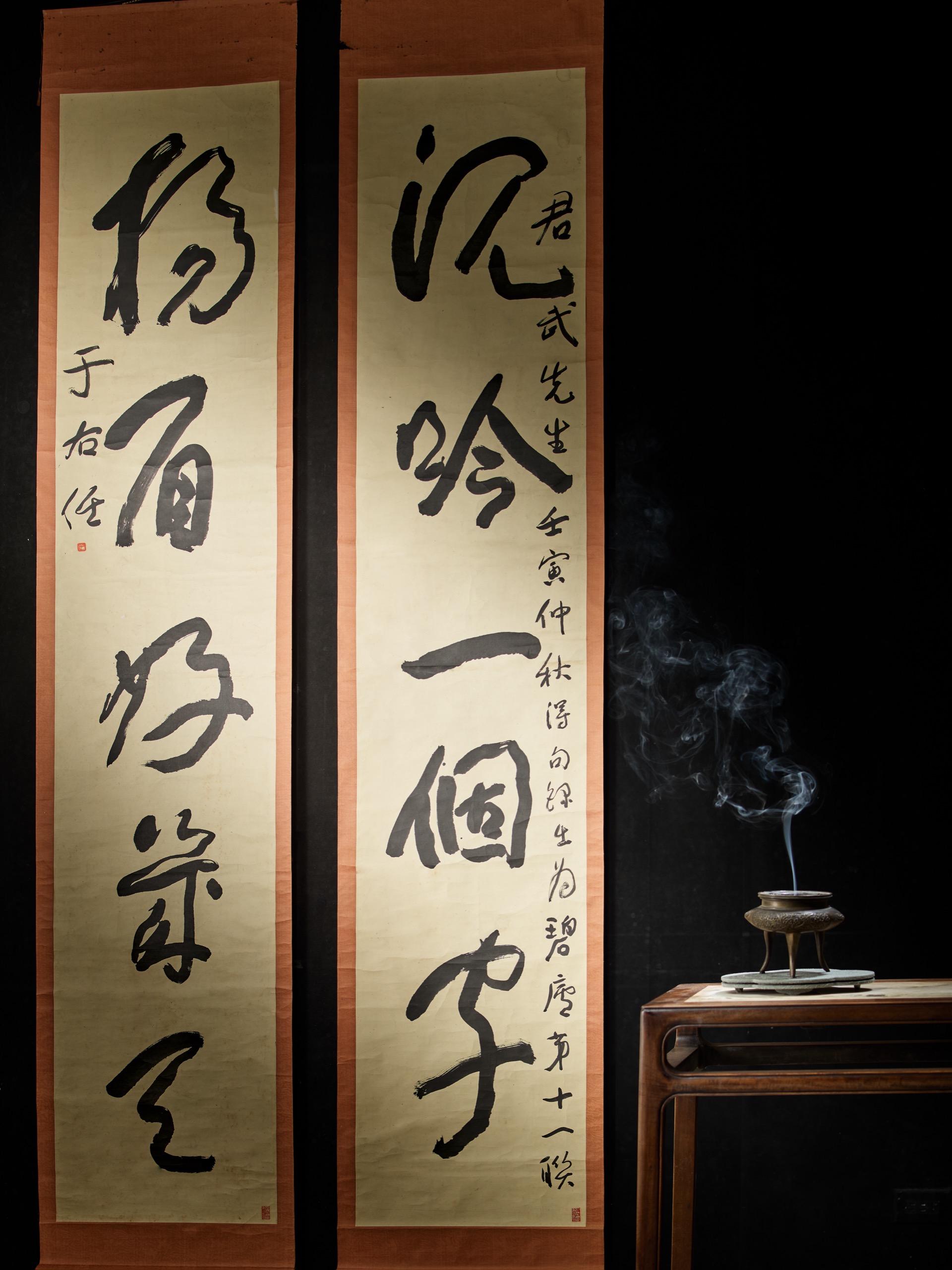 此對聯為標準草書的藝術巔峰精品,完美結合了他早年的北碑功底與晚年的純熟造詣,筆法圓勁古澹,落墨沉穩端莊。線條不刻意強調起筆的藏鋒與提按,呈現出一種自然拙趣。草書中帶有深厚的魏碑力量感,厚重且充滿韌性,使字體具有豪放壯闊的氣勢,這對聯長度高達 251 公分,如此巨大的尺幅更顯其筆力的沉厚與大開大闔的氣度。