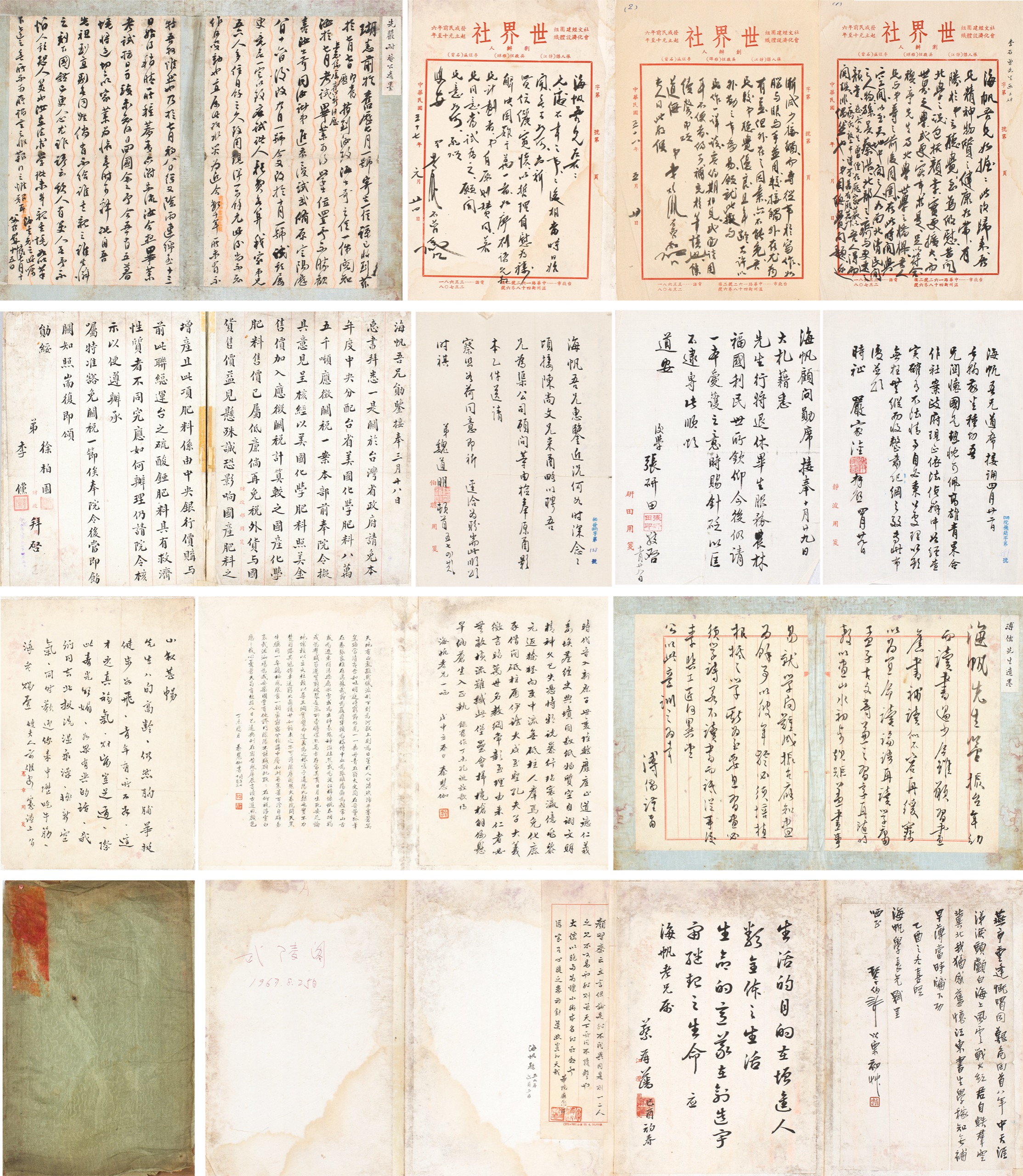 1.海帆吾兄勛鑒:接奉三月十八日惠書,拜悉一是。關於台灣省政府請免本年度中央分配台省美國化學肥料八萬五千噸應徵關稅一案,本部前奉院令,擬具意見呈核,經以美國化學肥料照美金售價加入應徵關稅計算較之國產化學肥料售價已屬低廉,倘再免稅,外貨與國貨售價益見懸殊,誠恐影響國產肥料之增產。且此項肥料係由中央銀行價購,與前此聯總運台之硫酸錏肥料具有救濟性質者不同,究應如何辦理,仍請院令核示以便遵辦。承囑 特准豁免關稅一節,俟奉院令後當即飭關知照。耑復即頌勛綏。 弟徐柏園、李儻拜啓。2.溥儒先生遺墨。海帆先生鑒,振台年幼而讀書過少,今雖願習畫,舊書補讀似不容再緩。竊以為:宜命讀《論語》再讀《學庸》、《孟子》古文等,兼之習字再隨時教以畫山水初步規矩。蓋畫事易就,學問難成。振台應知畫為餘事,以彼年齡必須培植根柢之學,斯為至要!且習畫必須學詩,若不讀書而祇從事後素,與工匠何異?望公以此意訓之為幸。溥儒謹肅。其餘文略