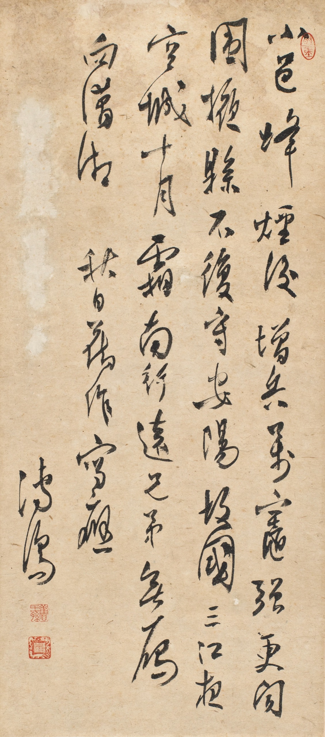 首頁 拍品總覽 2026迎春 share Lot. 3109 溥心畬Pu Hsin-Yu 1896-1963 書法條幅 NT$ 30,000-50,000RMB¥ 6,000-10,000HK$ 7,500-12,500 媒材/尺寸 鏡框 水墨 紙本, 58x26cm 款識 小邑烽煙後,增兵萬灶強。更聞圍掖縣,不復守安陽。故國三江夜,空城十月霜。南行遠兄弟,無雁向瀟湘。秋日舊作寫想,溥儒。 鈐印 明夷(朱)、舊王孫(朱)、溥儒(白) 來源 註:此幅作品挖款。 登記競投 返回拍品列表 拍品推薦 3294 黃檗柏岩 觀音 預估價:NT$ 30,000-50,000 2026迎春 3191 黃均 秋江晴嶂 預估價:NT$ 80,000-120,000 2026迎春 3246 陳子和 松石圖 預估價:NT$ 20,000-30,000 2026迎春 3305 鈕永建等書畫十件 1、鈕永建,壽字、書法,二件 2、陳立夫,對聯、條幅,二件 3、溥心畬,黃金果 4、劉太希,書法、佛畫,二件 5、孔德成,書法條幅(陳瑞庚代筆) 6、李石曾,書法條幅、風雨同舟,二件 預估價:NT$ 80,000-120,000 2026迎春 3109 溥心畬 書法條幅 預估價:NT$ 30,000-50,000 2026迎春 3068 湯滌(畫)、溥心畬(跋) 峰巒秋色 預估價:NT$ 80,000-150,000 2026迎春 3306 孫雲生等書畫六件 1、張其昀,福利民生-四字條 2、張維翰,蔣公嘉言 3、趙恆惕,隸書紅聯 4、謝稚柳,蘭花 5、馬壽華/吳平,王者之香 6、孫雲生,富貴白頭圖 預估價:NT$ 50,000-80,000 2026迎春 3288 高陽 波羅密心經 預估價:NT$ 100,000-150,000 2026迎春 3114 黃君璧 飛瀑雷鳴 預估價:NT$ 70,000-100,000 2026迎春 3237 佚名 刻臺靜農書法扇骨 預估價:NT$ 20,000-30,000 2026迎春