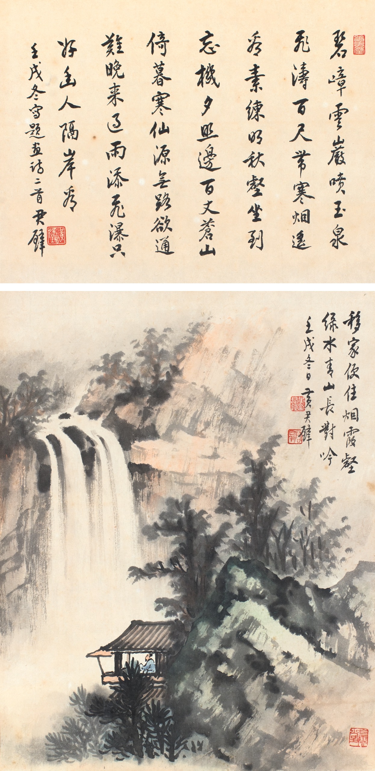 碧嶂雲巖噴玉泉,飛濤百尺帶寒煙。 遙看素練明秋壑,坐到忘機夕照邊。百丈蒼山倚暮寒,仙源無路欲通難。晚來過雨添飛瀑,只好幽人隔岸看。壬戌冬寫題畫詩二首,君璧。