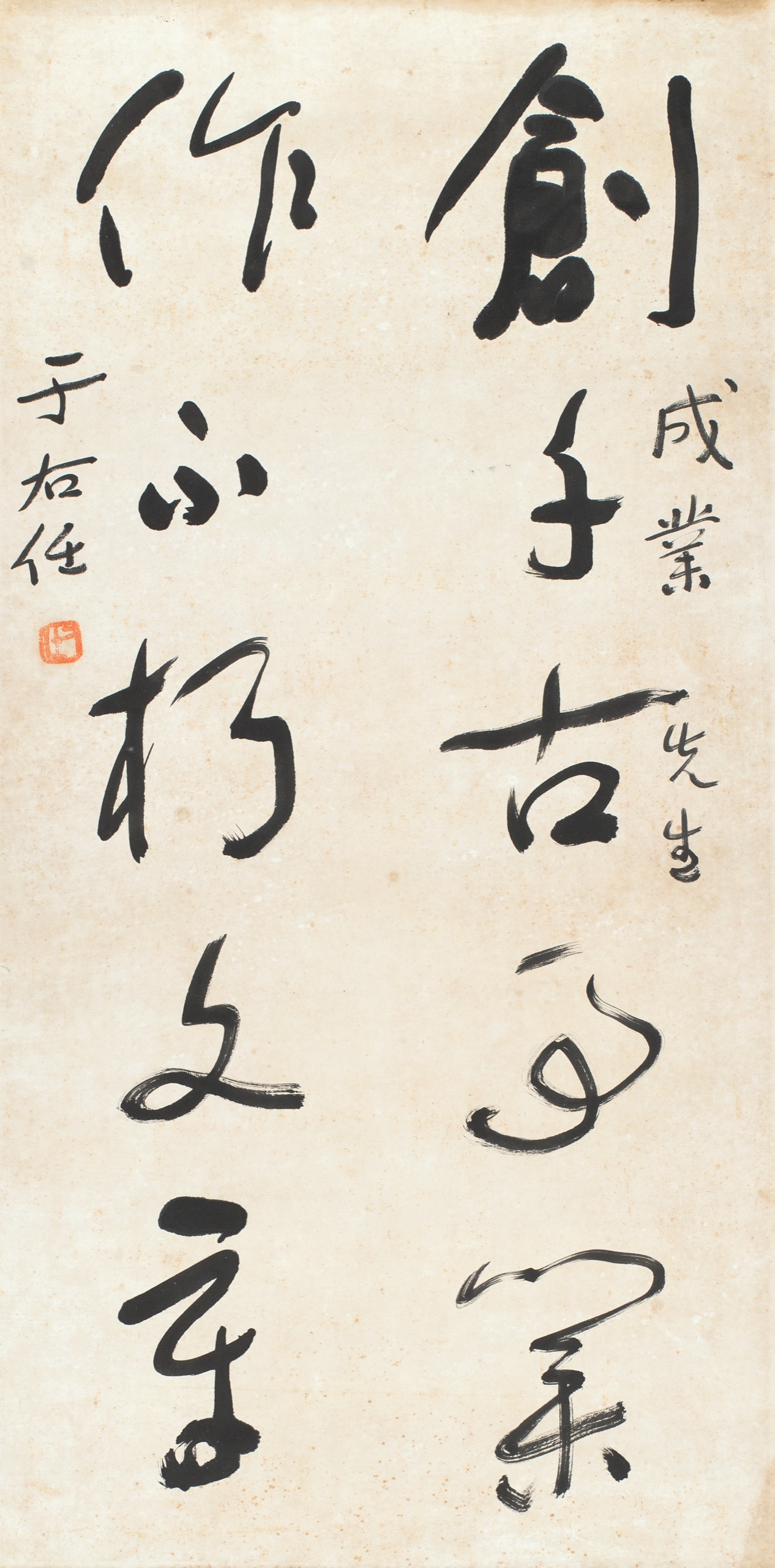 首頁 拍品總覽 2026迎春 share Lot. 3141 于右任Yu You-Ren 1879-1964 草書五言聯 NT$ 80,000-120,000RMB¥ 16,000-24,000HK$ 20,000-30,000 媒材/尺寸 鏡框 水墨 紙本, 67x33.5cm 款識 創千古事業,作不朽文章。成業先生,于右任。 鈐印 右任(朱)。 來源 上款人:成業先生。 賞析 上款人:成業先生。 登記競投 返回拍品列表 拍品推薦 3177 沈定一 五尺大中堂 預估價:NT$ 20,000-30,000 2026迎春 3120 溥心畬 團花回文詩行書七言聯 預估價:NT$ 150,000-250,000 2026迎春 3301 吳敬恆先生遺札等一批 1、 吳稚暉致憲睦叔公信札63頁紙、吳稚暉手繪地圖並圖示說明、吳稚暉致振岩先生信札 2、 蔣中正,為吳稚暉八十壽紀念稿 3、 蔡元培,信札 4、 楊森,信札 5、 徐悲鴻,信札 6、 李石曾,信札 預估價:NT$ 200,000-300,000 2026迎春 3052 溥心畬 工筆鳳凰木寫真圖 預估價:NT$ 1,200,000-2,000,000 2026迎春 3367 李霞 麻姑獻壽 預估價:NT$ 20,000-30,000 2026迎春 3327 謝稚柳 書法橫幅 預估價:NT$ 40,000-60,000 2026迎春 3093 張大千 竹雀圖 預估價:NT$ 800,000-1,200,000 2026迎春 3018 張大千 熊、蟋蟀圖、寫生翎毛圖 (三件一組) 預估價:NT$ 50,000-100,000 2026迎春 3386 黃幻吾 楓林翠鳥 預估價:NT$ 20,000-30,000 2026迎春 3248 于右任 草書黃花崗詩、親題明信片 (三件一組) 預估價:NT$ 70,000-100,000 2026迎春