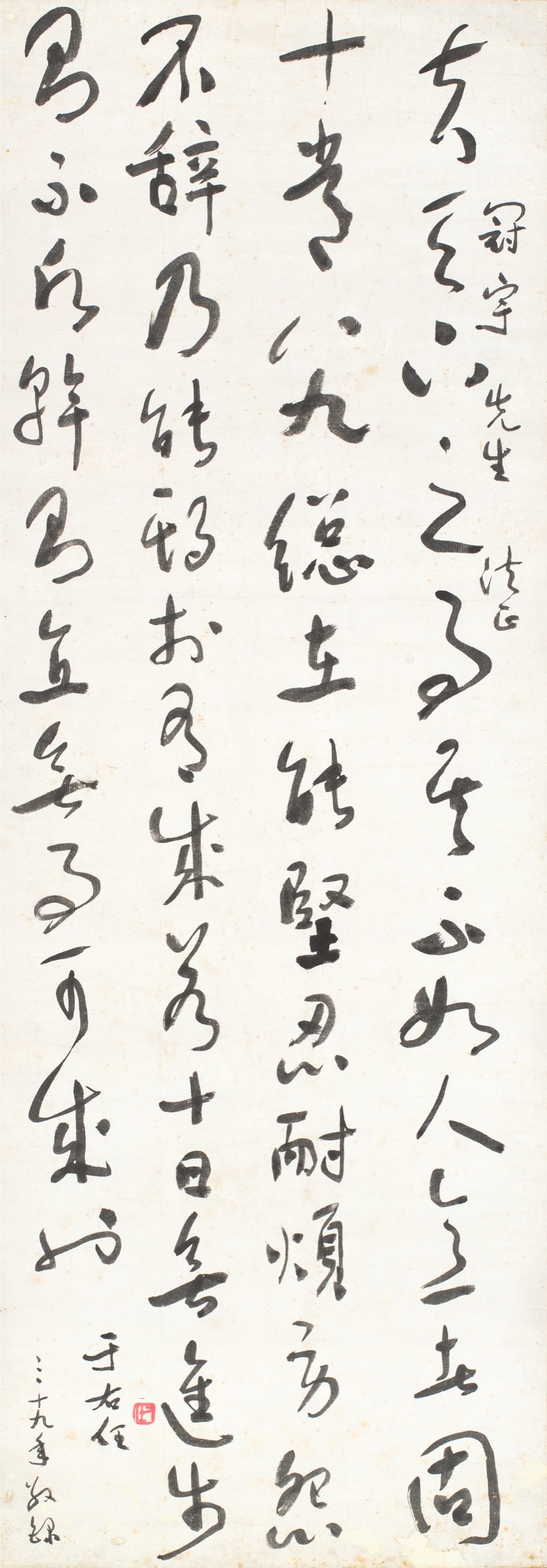 首頁 拍品總覽 2026迎春 share Lot. 3145 于右任Yu You-Ren 1879-1964 草書條幅 年代:1950 NT$ 150,000-250,000RMB¥ 30,000-50,000HK$ 37,500-62,500 媒材/尺寸 鏡框 水墨 紙本, 131x46cm 款識 夫天下之事,其不如人意者,固十常八九,總之在能堅忍耐煩,勞怨不辭,乃能期於有成。若十日無進步,則不願幹,則直無事可成也。冠宇先生法正,于右任,三十九年敬錄。 鈐印 右任(朱)。 來源 上款人:冠宇先生。 登記競投 返回拍品列表 拍品推薦 3017 張大千 臨錢舜舉太真上馬圖 預估價:NT$ 50,000-100,000 2026迎春 3097 溥心畬 觀音大仕聖像 預估價:NT$ 2,000,000-3,000,000 2026迎春 3086 張大千 盛夏荷香 預估價:NT$ 2,000,000-3,000,000 2026迎春 3295 施廷輔 觀音 預估價:NT$ 20,000-30,000 2026迎春 3054 溥心畬 輕舟已過萬重山 預估價:NT$ 200,000-300,000 2026迎春 3143 于右任 草書五言聯 預估價:NT$ 150,000-250,000 2026迎春 3113 黃君璧 秋溪訪友 預估價:NT$ 120,000-150,000 2026迎春 3261 喻仲林 鷹倨圖 預估價:NT$ 100,000-150,000 2026迎春 3285 鄭善禧 竹石清堅圖 預估價:NT$ 40,000-60,000 2026迎春 3303 胡崇賢等信札七件 1、 蔣緯國,致少谷先生 2、 張其昀,致李超哉信劄含封 3、 張道藩,弘揚風雅 4、 沈映冬,名片簽字筆紀錄、粥會約箋 5、 胡恆,原子筆條 6、 胡崇賢,雙壽 7、 李猷,篆書題百老百壽箋 預估價:NT$ 50,000-80,000 2026迎春