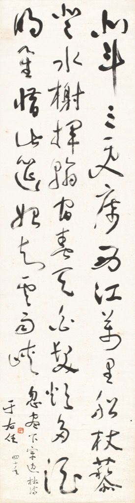 首頁 拍品總覽 2026迎春 share Lot. 3146 于右任Yu You-Ren 1879-1964 草書杜詩一首 年代:1951 NT$ 150,000-250,000RMB¥ 30,000-50,000HK$ 37,500-62,500 媒材/尺寸 立軸 水墨 紙本, 153x41.5cm 款識 北斗三更席,西江萬里船。杖藜登水榭,揮翰宿春天。白髮煩多酒,明星惜此筵。始知雲雨峽,忽盡下牢邊。杜詩四十年,于右任。 鈐印 右任(朱)。 登記競投 返回拍品列表 拍品推薦 3222 吳穀祥 瀟湘秋思 預估價:NT$ 50,000-80,000 2026迎春 3360 王宸 劉海戲金蟾 預估價:NT$ 20,000-30,000 2026迎春 3084 惠榮 楷書節錄董其昌《畫禪室隨筆》四屏 預估價:NT$ 40,000-60,000 2026迎春 3210 江兆申 西湖古松圖 預估價:NT$ 250,000-400,000 2026迎春 3326 王福庵 臨《寰盤銘文》 預估價:NT$ 80,000-120,000 2026迎春 3297 趙樸初等大德 書法十開(日中平和觀光友好訪中團名簿) 預估價:NT$ 80,000-120,000 2026迎春 3056 溥心畬 寶晉垂虹行書七言聯 預估價:NT$ 150,000-250,000 2026迎春 3382 石谿 看泉圖 預估價:NT$ 80,000-120,000 2026迎春 3202 拓本、江兆申(題) 漢西狹頌四條屏 預估價:NT$ 200,000-300,000 2026迎春 3351 潘嵐 花鳥走獸四屏 預估價:NT$ 20,000-30,000 2026迎春