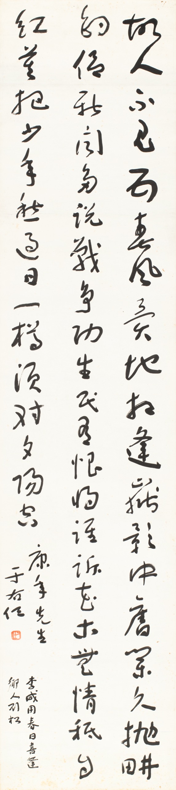 首頁 拍品總覽 2026迎春 share Lot. 3147 于右任Yu You-Ren 1879-1964 草書《春日喜逢鄉人劉松》 NT$ 150,000-250,000RMB¥ 30,000-50,000HK$ 37,500-62,500 媒材/尺寸 鏡框 水墨 紙本, 152x34.5cm 款識 故人不見五春風,異地相逢嶽影中。舊業久拋耕釣侶,新聞多說戰爭功。生民有恨將誰訴,花木無情只自紅。莫把少年愁過日,一樽須對夕陽空。康年先生,于右任。李咸用春日喜逢鄉人劉松。 鈐印 右任(朱)。 登記競投 返回拍品列表 拍品推薦 3070 蕭俊賢(畫)、溥心畬(題) 溪山靜逸 預估價:NT$ 50,000-80,000 2026迎春 3063 溥心畬(題)、溫碧英(畫) 硃筆鍾馗 預估價:NT$ 50,000-80,000 2026迎春 3074 吳子深 長林石壑/風竹圖(二件一組) 預估價:NT$ 30,000-50,000 2026迎春 3235 大風堂供石 奇石供石擺件 預估價:NT$ 50,000-100,000 2026迎春 3010 張大千 仿仇十州白描人物卷鉤本 預估價:NT$ 50,000-100,000 2026迎春 3249 莊嚴、陳立夫、董作賓 書法(三件一組) 預估價:NT$ 60,000-80,000 2026迎春 3324 崇綺(同治滿族狀元) 書法條幅 預估價:NT$ 40,000-60,000 2026迎春 3181 溥心畬 行書七言聯 預估價:NT$ 120,000-160,000 2026迎春 3169 于右任、高逸鴻 草書五言聯、魚樂圖(二件一組) 預估價:NT$ 190,000-250,000 2026迎春 3014 張大千 宮樂圖、宮中圖、獵騎圖 (三件一組) 預估價:NT$ 50,000-100,000 2026迎春