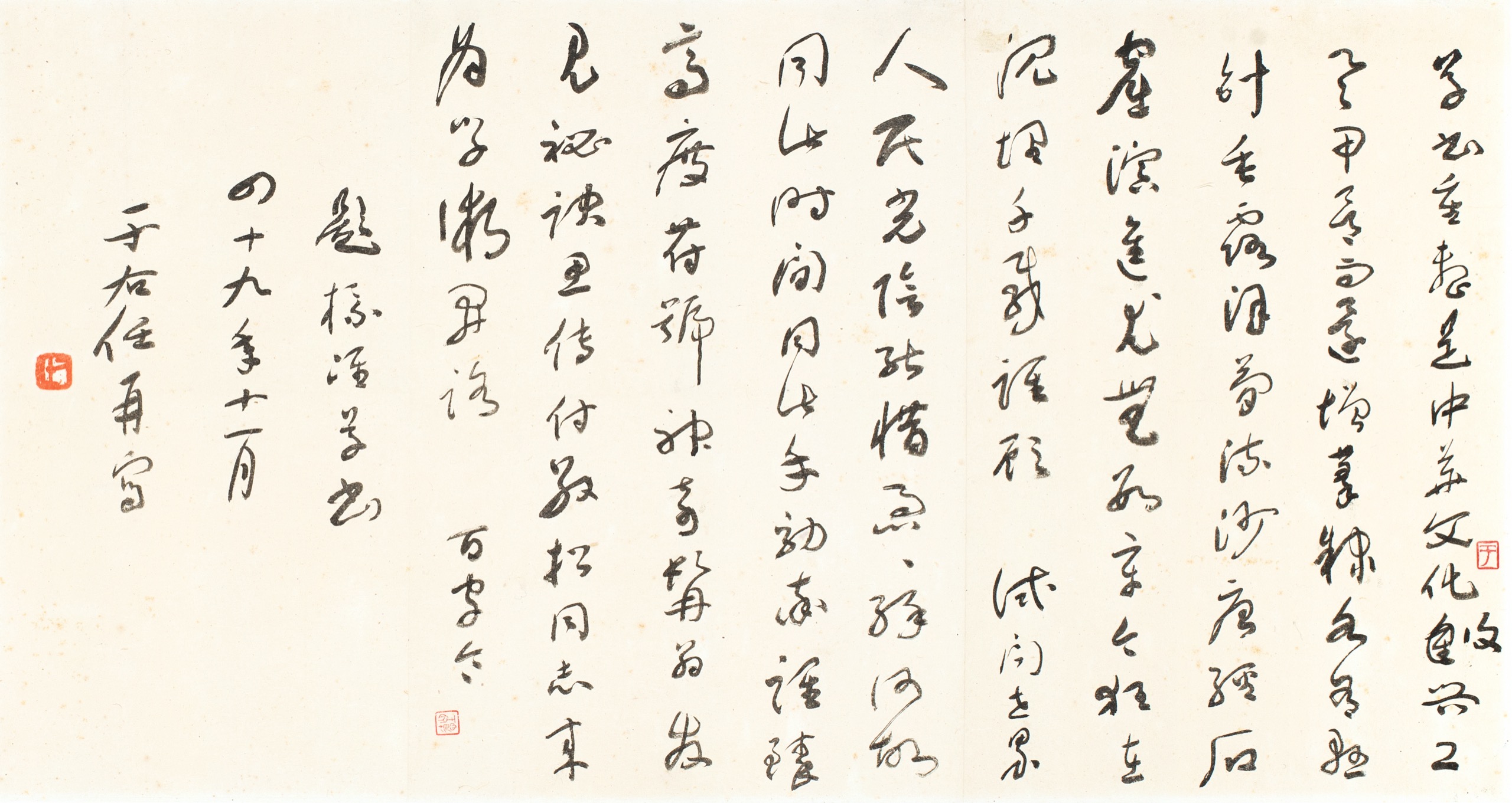 首頁 拍品總覽 2026迎春 share Lot. 3152 于右任Yu You-Ren 1879-1964 草書題標準草書 年代:1960 NT$ 150,000-250,000RMB¥ 30,000-50,000HK$ 37,500-62,500 媒材/尺寸 鏡框 水墨 紙本, 39.5x74cm 款識 草書重整是中華文化復興工具,甲骨而還增篆隸,各有懸針垂露。漢簡流沙,唐經石窟,演進尤無數。章今狂在,沉埋千載誰顧!試問世界人民,寸陰能惜,急急緣何故?同此時間同此手,效率誰臻高度?符號神奇,髯翁發見,秘訣思傳付。敬招同志,來為學術開路。百字令。題標準草書,四十九年十一月,于右任再寫。 鈐印 于(朱)、右任(朱)、望德(朱)。 登記競投 返回拍品列表 拍品推薦 3049 黃賓虹、鄒夢禪 秋山雲林 預估價:NT$ 500,000-800,000 2026迎春 3259 李義弘 虛堂秋色圖 預估價:NT$ 60,000-80,000 2026迎春 3080 馬曰璐 行書七言聯 預估價:NT$ 40,000-60,000 2026迎春 3274 余承堯 山高月小詩軸 預估價:NT$ 20,000-30,000 2026迎春 3293 黃檗木庵 觀音 預估價:NT$ 50,000-80,000 2026迎春 3067 于右任 草書《唯堅忍乃能成功》 預估價:NT$ 120,000-150,000 2026迎春 3001 孫雲生 天風海水圖 預估價:NT$ 5,000-10,000 2026迎春 3090 張大千 富貴天香圖 預估價:NT$ 500,000-800,000 2026迎春 3133 吳子深 墨筆竹石圖 預估價:NT$ 30,000-50,000 2026迎春 3131 吳子深 曉日群山 預估價:NT$ 50,000-80,000 2026迎春