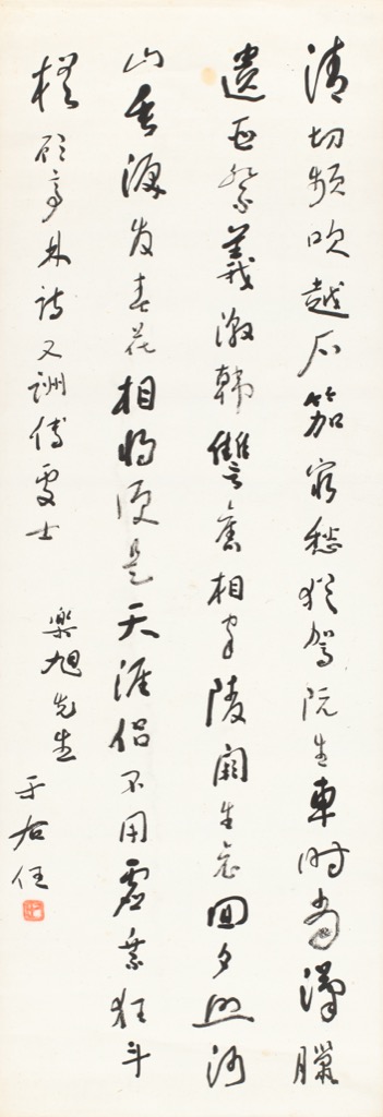 首頁 拍品總覽 2026迎春 share Lot. 3157 于右任Yu You-Ren 1879-1964 草書顧亭林詩 NT$ 120,000-160,000RMB¥ 24,000-32,000HK$ 30,000-40,000 媒材/尺寸 鏡框 水墨 紙本, 98.5x34cm 款識 清切頻吹越石笳,窮愁猶駕阮生車。時當漢臘遺臣祭,義激韓讎舊相家。陵闕生哀回夕照,河山垂淚發春花。相將便是天涯侶,不用虛乘犯鬥槎。顧亭林詩又酬傅處士。樂旭先生,于右任。 鈐印 右任(朱)。 來源 上款人:樂旭先生。 登記競投 返回拍品列表 拍品推薦 3032 沙馥 四美圖 預估價:NT$ 120,000-200,000 2026迎春 3195 臺靜農 隸書五言聯 預估價:NT$ 400,000-600,000 2026迎春 3103 溥心畬 朱竹 預估價:NT$ 150,000-250,000 2026迎春 3222 吳穀祥 瀟湘秋思 預估價:NT$ 50,000-80,000 2026迎春 3139 于右任 草書五言聯 預估價:NT$ 200,000-300,000 2026迎春 3220 蔣澂芬 花鳥蟲圖冊(12幅) 預估價:NT$ 120,000-200,000 2026迎春 3278 沈耀初 老梅孤鳥 預估價:NT$ 150,000-250,000 2026迎春 3244 傅申 題大風堂臨敦煌壁畫 預估價:NT$ 10,000-20,000 2026迎春 3345 李瑞清(清道人) 隸書五言聯 預估價:NT$ 50,000-80,000 2026迎春 3381 誼晉齊書法拓本(16開) 預估價:NT$ 20,000-30,000 2026迎春