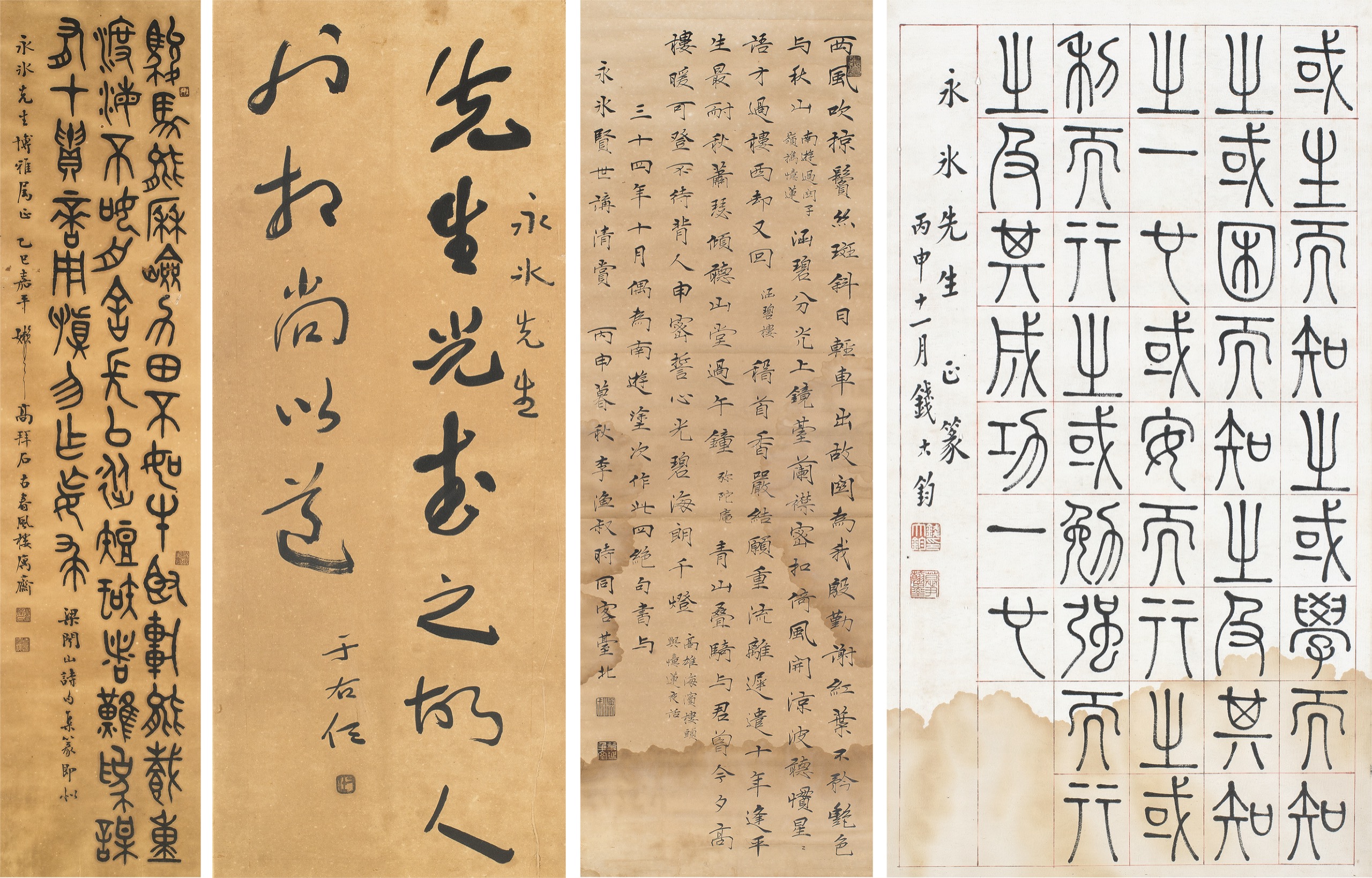 首頁 拍品總覽 2026迎春 share Lot. 3174 于右任、錢大鈞、李漁叔、高拜石Yu You-Ren 1879-1964 書法(四件一組) NT$ 80,000-120,000RMB¥ 16,000-24,000HK$ 20,000-30,000 媒材/尺寸 鏡框 水墨 紙本, 84x34.5cm、69x39cm、90x30cm、138x32cm 款識 光武之故人也,相尚以道。永冰先生,于右任。 鈐印 右任 ( 朱 )。 來源 上款人:佘永冰先生。 賞析 上款人:佘永冰,生於民國14年,上海人。曾任臺灣新生報業股份有限公司董事會會計主任。 登記競投 返回拍品列表 拍品推薦 3127 江兆申 柴門夕趣 預估價:NT$ 200,000-300,000 2026迎春 3142 于右任 草書五言聯 預估價:NT$ 120,000-160,000 2026迎春 3320 臺靜農(畫)、董橋(題) 墨梅圖 預估價:NT$ 100,000-150,000 2026迎春 3152 于右任 草書題標準草書 預估價:NT$ 150,000-250,000 2026迎春 3118 溥心畬 百壽遐齡 預估價:NT$ 150,000-250,000 2026迎春 3199 臺靜農 擬石門頌隸書屏 預估價:NT$ 150,000-250,000 2026迎春 3025 張大千 大風堂藏韓幹圉人呈馬圖(複製本) 張大千題贈孫雲生收藏 預估價:NT$ 50,000-100,000 2026迎春 3026 張大千 大風堂藏宋徽宗臨摹張萱搗練圖(複製本) 張大千題贈孫雲生收藏 預估價:NT$ 50,000-100,000 2026迎春 3343 溥心畬 行書寒玉堂詩 預估價:NT$ 20,000-30,000 2026迎春 3208 鄭曼青 墨竹圖 預估價:NT$ 70,000-100,000 2026迎春