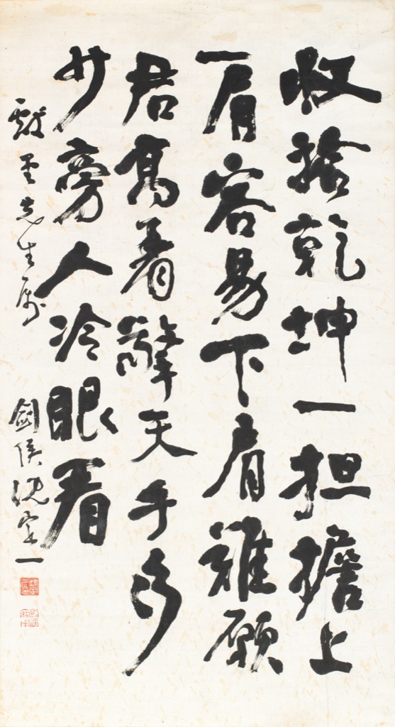 收拾乾坤一担擔,上肩容易下肩難。願君高著擎天手,多少旁人冷眼看。獻堂先生屬,劍侯沈定一。