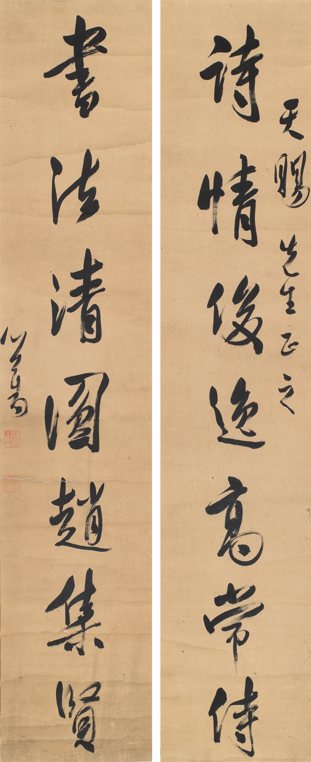 首頁 拍品總覽 2026迎春 share Lot. 3181 溥心畬Pu Hsin-Yu 1896-1963 行書七言聯 NT$ 120,000-160,000RMB¥ 24,000-32,000HK$ 30,000-40,000 媒材/尺寸 立軸 水墨 紙本, 104x25cm x2 款識 詩情俊逸高常侍,書法清圓趙集賢。天賜先生正之,心畬。 鈐印 溥儒之印(白)、心畬翰墨(朱)。 來源 上款人:陳天賜先生。 登記競投 返回拍品列表 拍品推薦 3349 劉旦宅(題)、肖雲(畫) 貂裘出塞圖 預估價:NT$ 20,000-30,000 2026迎春 3274 余承堯 山高月小詩軸 預估價:NT$ 20,000-30,000 2026迎春 3319 臺靜農 詩外簃 預估價:NT$ 150,000-250,000 2026迎春 3228 李奇茂 燒餅油條 預估價:NT$ 80,000-120,000 2026迎春 3234 大風堂供石(張大千親題) 壽安石門 奇石供石擺件 預估價:NT$ 80,000-120,000 2026迎春 3383 謝琯樵 梅雀迎春四屏 預估價:NT$ 40,000-60,000 2026迎春 3119 溥心畬 蝴蝶蘭 預估價:NT$ 150,000-250,000 2026迎春 3018 張大千 熊、蟋蟀圖、寫生翎毛圖 (三件一組) 預估價:NT$ 50,000-100,000 2026迎春 3269 余承堯 奇峰清流圖 預估價:NT$ 160,000-240,000 2026迎春 3081 孫智敏 楷書七言聯 預估價:NT$ 40,000-60,000 2026迎春