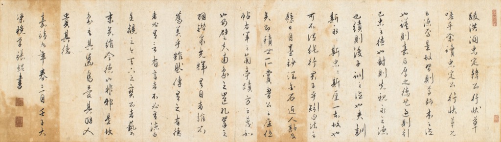 跋《洪洞忠定韓公行狀》草嗟乎!余讀忠定公行狀草,見五德焉。是故習則尊師,本之譣也。謨則嘉后,厚之德也。過則引己,忠之德也。封則先親,永之德也。績則後子,訓之譣也。夫訓斯永永,斯忠忠斯。垕一本故也。可不謂純行君子乎?矧曰:「法言懸日月,墨玅潤金石。」近人尠及矣。即積世□賞魯公之座位帖、右軍之蘭亭蹟,方之蔑如也。乃譬夫南象之□,孔翠之羽。錯?光輝,有目者誰不為美乎?雖然傳有之,有德者必有言,有言者不必有德,由是觀之,今天下之寶公者,藝末矣,綰令德也,非邪?是故象重其齒,鳥愛其羽,人貴其德。嘉靖九年春三月壬子,大梁晚學張鯤書。