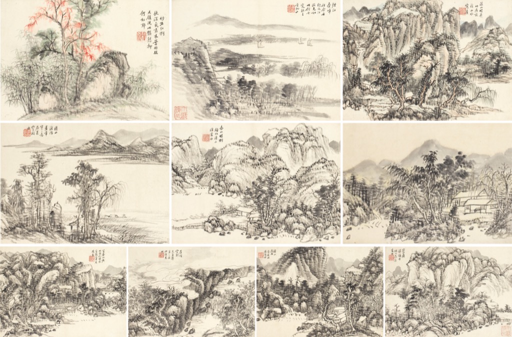 1.溪山晴爽。此為前溪山水寫真。2.煙江疊嶂。往余舟行之江所見如此,何必定效王晉卿也。3.竹石紅樹。秋深氣肅木葉將脫,又復現此艷態,抑何故耶?5.春山晴樹。頗似溪山深處也。6.溪山漁隱。著筆寥寥,意在苕霅間也。7.空山飛瀑。儼然城山泉落處也。8.溪山過雨。前溪雨後境也。9.蒼峭雲封。炎夏鬱蒸之際時獲見此。10.富春山居。此圖似曾於富陽山中見過者。