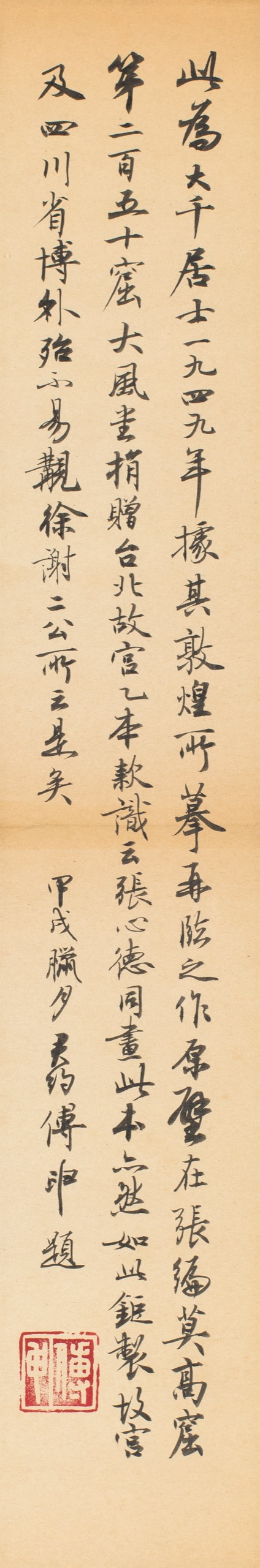 首頁 拍品總覽 2026迎春 share Lot. 3244 傅申Fu Shen 1937-2024 題大風堂臨敦煌壁畫 年代:1994 NT$ 10,000-20,000RMB¥ 2,000-4,000HK$ 2,500-5,000 媒材/尺寸 鏡框 水墨 紙本, 59x10cm 款識 此為大千居士一九四九年,據其敦煌所摹再臨之作,原壁在張編莫高窟第二百五十窟,大風堂畫捐贈台北故宮乙本,款識云:張心德同畫,此本亦然,如此鉅製故宮及四川省博外殆不易覯,徐、謝二公所云是矣。甲戌臘月君約傅申題。 鈐印 傅申(白)。 登記競投 返回拍品列表 拍品推薦 3107 溥心畬 簽名照 (張大千、溥心畬、董作賓、張默君) 、 溥心畬、張默君 (書法) 預估價:NT$ 80,000-120,000 2026迎春 3316 臺靜農 隸書五言聯 預估價:NT$ 120,000-160,000 2026迎春 3152 于右任 草書題標準草書 預估價:NT$ 150,000-250,000 2026迎春 3127 江兆申 柴門夕趣 預估價:NT$ 200,000-300,000 2026迎春 3137 李義弘、呂淑珍、王壯為、姚夢谷、杜忠誥、葉醉白、吳平羅、羅振賢 黃天才上款書畫(十件一組) 預估價:NT$ 50,000-80,000 2026迎春 3344 溥伒 團龍行書七言聯 預估價:NT$ 50,000-80,000 2026迎春 3337 齊白石 群蝦圖 預估價:NT$ 200,000-300,000 2026迎春 3207 拓本 程修已墓誌 ( 臺靜農印 ) 大眼造像( 江兆申印 ) 預估價:NT$ 30,000-50,000 2026迎春 3046 張大千 看梅圖 預估價:NT$ 600,000-1,200,000 2026迎春 3303 胡崇賢等信札七件 1、 蔣緯國,致少谷先生 2、 張其昀,致李超哉信劄含封 3、 張道藩,弘揚風雅 4、 沈映冬,名片簽字筆紀錄、粥會約箋 5、 胡恆,原子筆條 6、 胡崇賢,雙壽 7、 李猷,篆書題百老百壽箋 預估價:NT$ 50,000-80,000 2026迎春