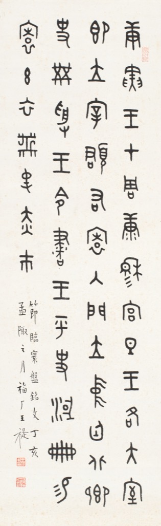 首頁 拍品總覽 2026迎春 share Lot. 3326 王福庵Wang Fu-An 1880-1960 臨《寰盤銘文》 年代:1947 NT$ 80,000-120,000RMB¥ 16,000-24,000HK$ 20,000-30,000 媒材/尺寸 鏡片 水墨 紙本, 104x32.5cm 款識 庚寅。王在周康穆宮。旦,王各大室。即位。宰頵佑寰入門,立中廷,北向。史□受王命書,王呼史淢冊。賜寰玄衣、鵬純、赤巿。節臨寰盤銘文,丁亥孟陬之月,福厂王禔。 鈐印 麋研齋(朱)、王禔私印(白)、福厂六十歲後所書(白)。 登記競投 返回拍品列表 拍品推薦 3070 蕭俊賢(畫)、溥心畬(題) 溪山靜逸 預估價:NT$ 50,000-80,000 2026迎春 3063 溥心畬(題)、溫碧英(畫) 硃筆鍾馗 預估價:NT$ 50,000-80,000 2026迎春 3299 于右任等書法四件 1、于右任,周母八十壽序-箋條 2、狄膺,東籬人淡-書法 3、 陳立夫,以粥會友 4、 陳定山,致狄膺君武道長橫幅 預估價:NT$ 50,000-80,000 2026迎春 3036 齊白石 香菇竹筍 預估價:NT$ 800,000-1,500,000 2026迎春 3022 張大千 無量壽佛 預估價:NT$ 50,000-100,000 2026迎春 3120 溥心畬 團花回文詩行書七言聯 預估價:NT$ 150,000-250,000 2026迎春 3136 臺靜農 半畝榕湖齋 預估價:NT$ 200,000-300,000 2026迎春 3345 李瑞清(清道人) 隸書五言聯 預估價:NT$ 50,000-80,000 2026迎春 3038 張大千 潑墨黃山 預估價:NT$ 10,000,000-15,000,000 2026迎春 3226 李奇茂 士林夜市 預估價:NT$ 80,000-150,000 2026迎春