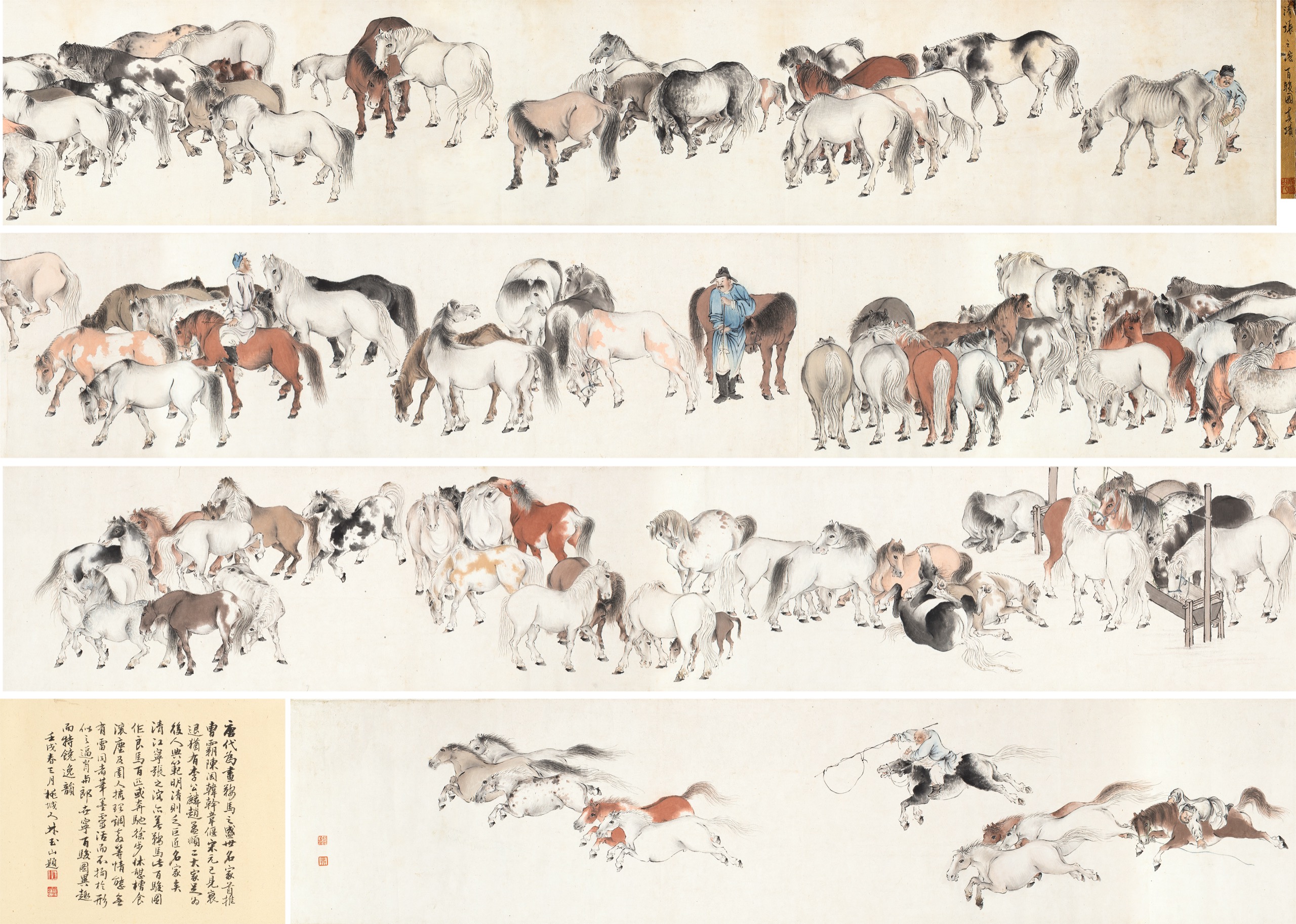 題簽:清張之溶百駿圖真蹟。林玉山跋:唐代為畫鞍馬之盛世,名家首推曹霸、陳閎、韓幹、韋偃。宋、元已見衰退,猶有李公麟、趙孟頫二大家足為後人典範,明、清則乏巨匠名家矣。清江寧張之溶亦善鞍馬,此百駿圖作良馬百匹,或奔馳、徐步、休憩、槽食、滾塵及圉人梳理調教等情態,無有雷同者。筆墨靈活而不拘於形似之逼肖,與郎世寧百駿圖異趣而特饒逸韻。壬戌春三月,桃城人林玉山題。