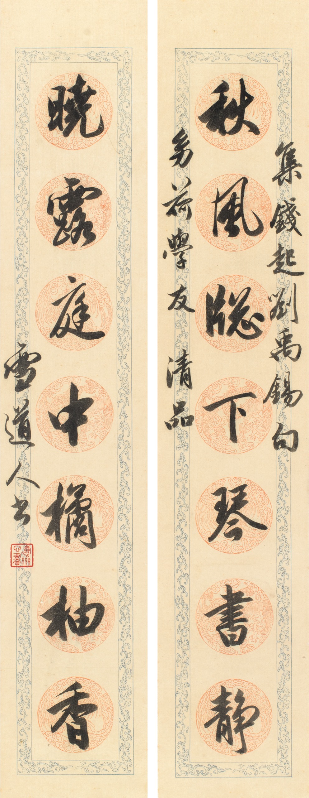 首頁 拍品總覽 2026迎春 share Lot. 3344 溥伒Pu Jin 1893-1966 團龍行書七言聯 NT$ 50,000-80,000RMB¥ 10,000-16,000HK$ 12,500-20,000 媒材/尺寸 鏡框 水墨 紙本, 77.5x14.5cm x2 款識 秋風牎下琴書靜,曉露庭中橘柚香。集錢起、劉禹錫句,幼荷學友清品,雪道人書。 鈐印 濂齋心畫(朱)。 來源 上款人:曾幼荷。 賞析 溥伒,字雪齋,號雪道人。清道光帝曾孫,恭親王奕訢之孫,與溥儒為兄弟行。工山水、花鳥、人物,書法宗趙孟頫,曾任輔仁大學美術系主任。上款人曾幼荷(1925-2017)為其學生,後與德籍學者艾克結為伉儷,移居美國。 登記競投 返回拍品列表 拍品推薦 3011 張大千 印度仕女、番女醉舞圖、香供養天女圖 (三件一組) 預估價:NT$ 50,000-100,000 2026迎春 3104 溥心畬 楷書記藻 預估價:NT$ 1,200,000-2,000,000 2026迎春 3293 黃檗木庵 觀音 預估價:NT$ 50,000-80,000 2026迎春 3361 王昱 仿一峯老人筆意山水 預估價:NT$ 20,000-30,000 2026迎春 3021 張大千 《臨明仇英千秋絕豔圖》 預估價:NT$ 1,200,000-2,000,000 2026迎春 3281 鄭善禧 牧牛童子 預估價:NT$ 250,000-350,000 2026迎春 3335 丁寶書 魚樂圖 扇面 預估價:NT$ 50,000-80,000 2026迎春 3239 羅聘 鍾馗 預估價:NT$ 120,000-200,000 2026迎春 3070 蕭俊賢(畫)、溥心畬(題) 溪山靜逸 預估價:NT$ 50,000-80,000 2026迎春 3338 金夢石 松鼠葡萄 預估價:NT$ 40,000-60,000 2026迎春